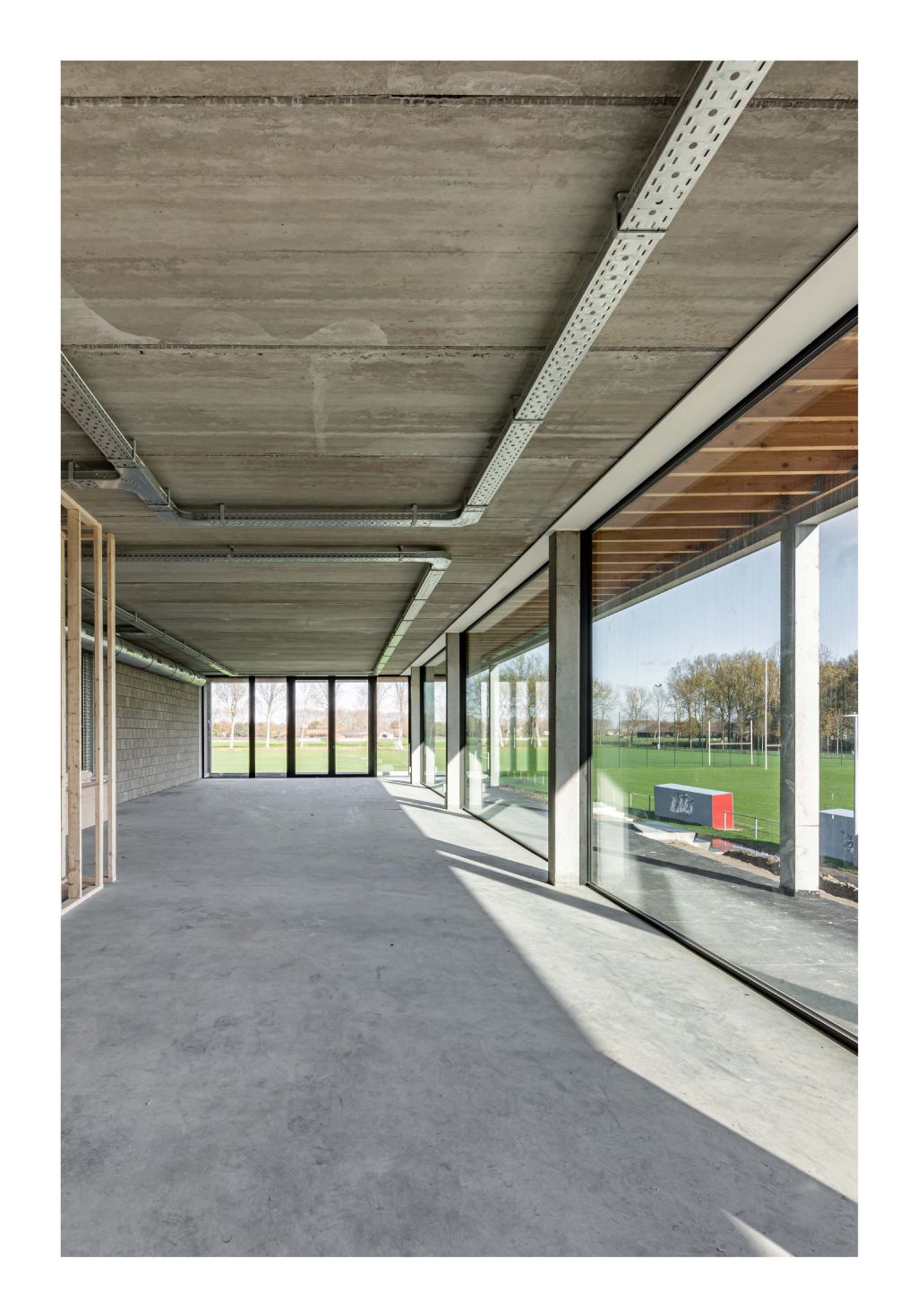 Er werd gekozen voor een gebouw in twee bouwlagen. Zo kan er, ondanks de noodgedwongen vrijstaande opstelling van het gebouw, toch compact gebouwd worden. De maximaal opengewerkte cafetaria met zicht op de sportvelden wordt geplaatst op een massieve sokkel van voorzieningen zoals kleedkamers, sanitair, douches, opslagruimtes,…