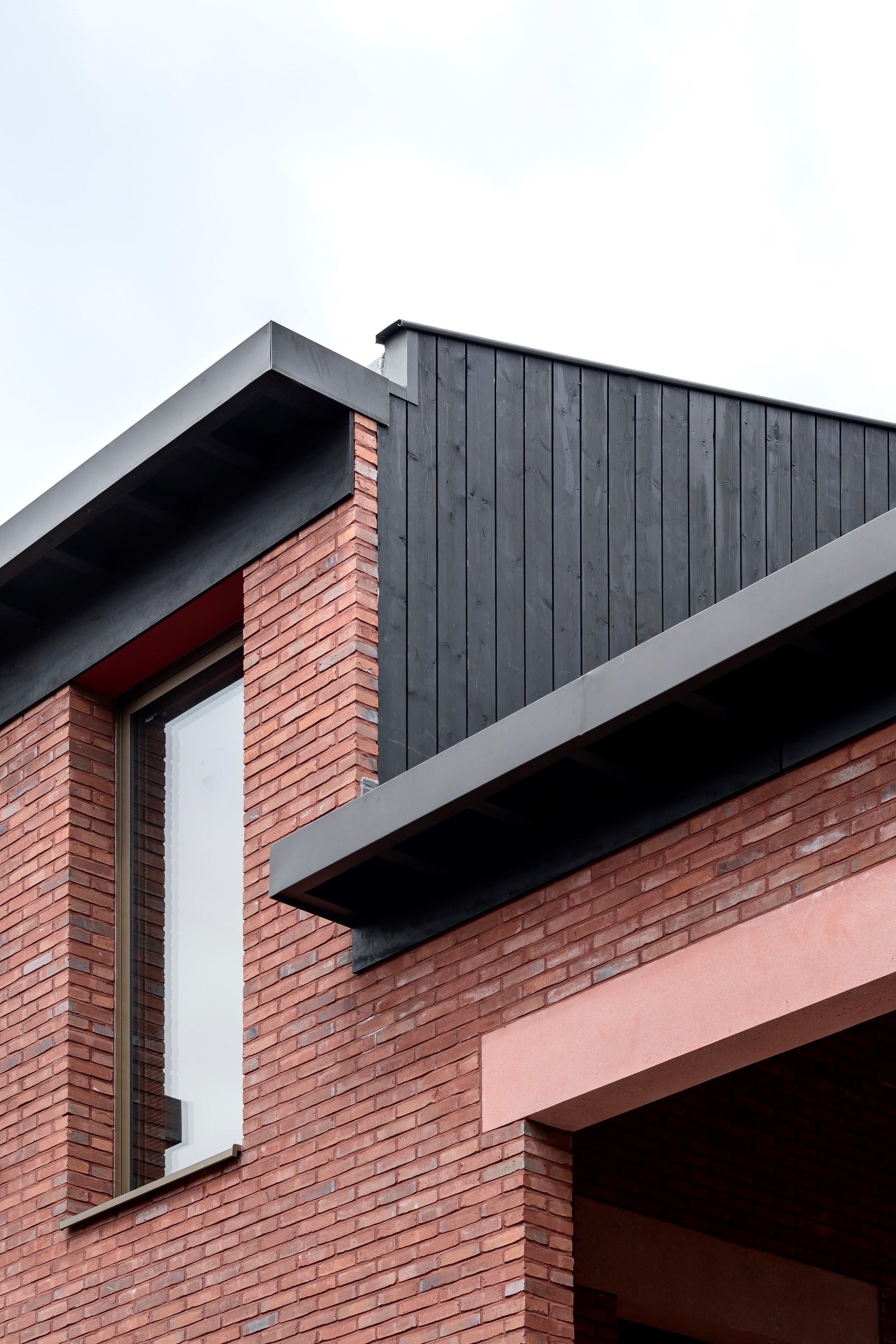 De overdekte buitenruimte is de centrale plek om binnen te komen, alle voordeuren geven hier op uit. Deze speelstraat is weliswaar niet publiek maar gevelplint en stoeptegels halen de band met de straat aan. Een sprong in snede laat toe om binnen het maximaal beschikbare gabarit een extra verdieping te puzzelen.