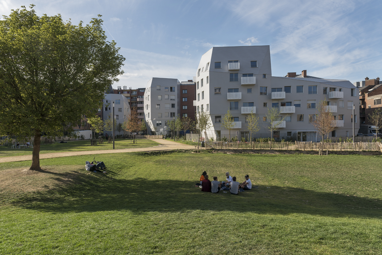 Dankzij de atypische geleding van de bouwvolumes krijgt het aangrenzende park van meer dan 10.000 m² alle ruimte om zich te ontplooien. Het is zowel een binnengebied als een openbaar park, dat fungeert als doorsteek én ontmoetingsplaats voor bewoners, bezoekers en passanten. De architecten van B612 legden de nadruk op de wisselwerking tussen privé- en publieke ruimtes. Ook de openbare tuinen, gemeenschappelijke moestuinen en sportterreinen dragen bij tot de creatie van een gemeenschapsgevoel.