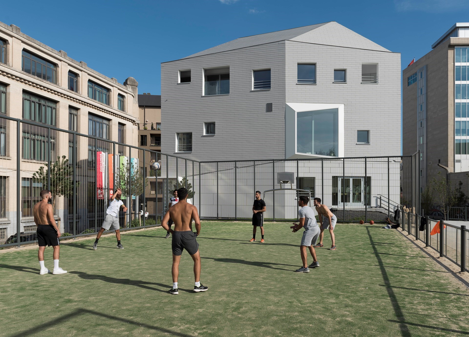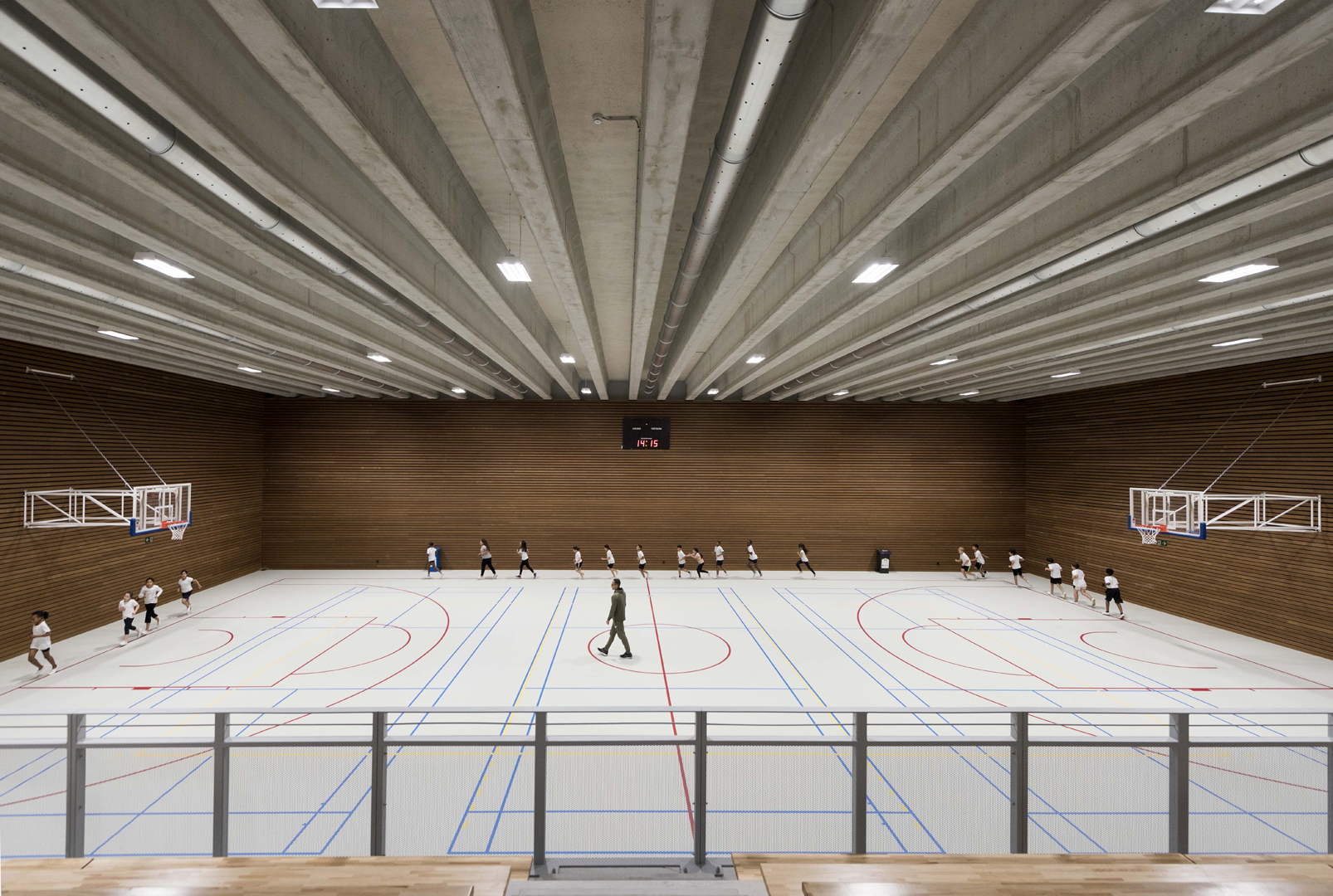 De sporthal, die twee niveaus bestrijkt – er wordt gesport op het dak en in de kelder – is een bouwkundig hoogstandje, vertelt Li Mei Tsien, architecte en medeoprichtster van het bureau B612. "De zaal op kelderniveau, die bestemd is voor wedstrijdsporten, is ondergedompeld in de grondwaterspiegel. Ze bestaat uit een omhulsel van secanspalen die het netwerk van prefabbalken ondersteunen en een eerste waterdichte barrière vormen, aangevuld met innovatieve technologieën op het vlak van soepele gedraineerde bekuiping, volgens de codes van de British Standard 8102 voor de realisatie van waterdichte kelders voor publieke functies (naar het voorbeeld van de Londense musea langs de Theems). Het interieur is vervolgens afgewerkt met een geluidsabsorberende houten bekleding."