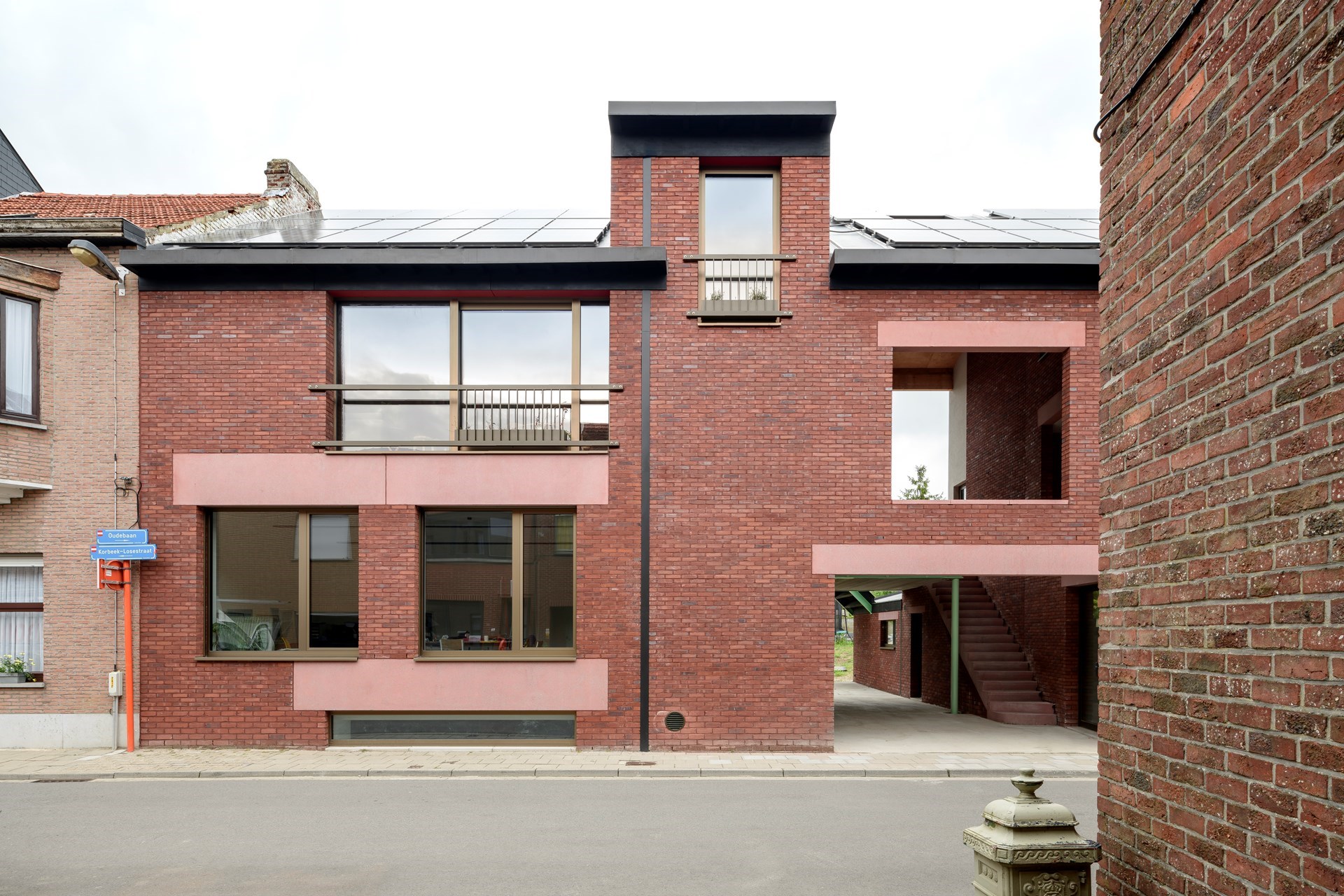 In Leuven ontwierp Carton123 architecten een collectief woonproject waar twee familiegeneraties zorgen voor elkaar. Dankzij een slimme schakeling van wooneenheden konden de ontwerpers vijf woningen creëren op een perceel waarop voorheen slechts één woning met garage stond, zonder dat het gebouw een overmaatse monoliet in het dichte stadsweefsel wordt. Het gebouw past naadloos in de straat met eerder smalle rijwoningen, maar krijgt door de herkenbare gevel in baksteen en roze beton toch een duidelijk adres in de stad. Lambda-max stond in voor de stabiliteitsstudie. Het project is genomineerd voor de Belgian Building Awards 2022 in de categorie Groepswoningbouw.