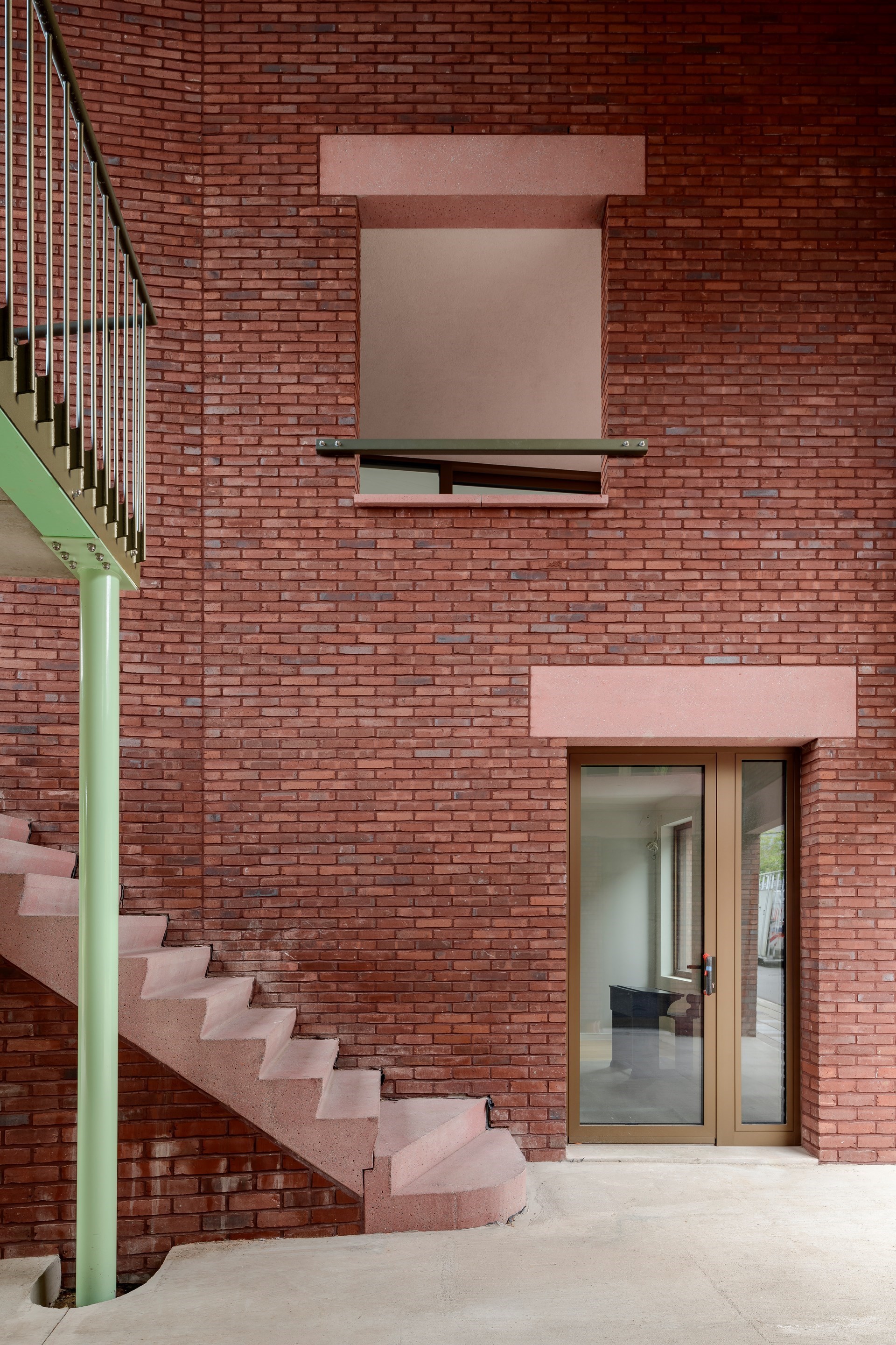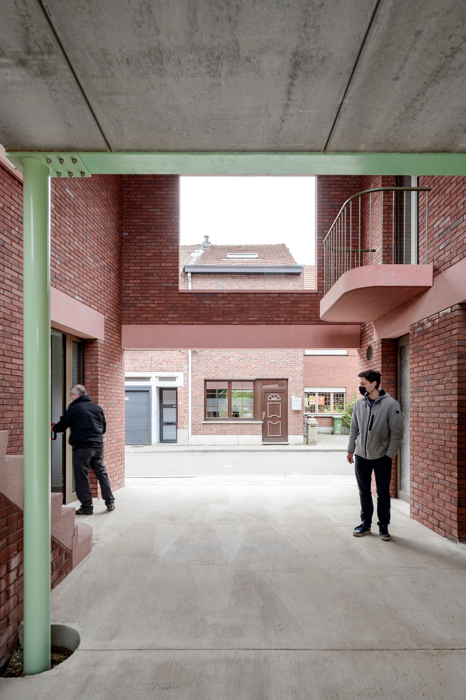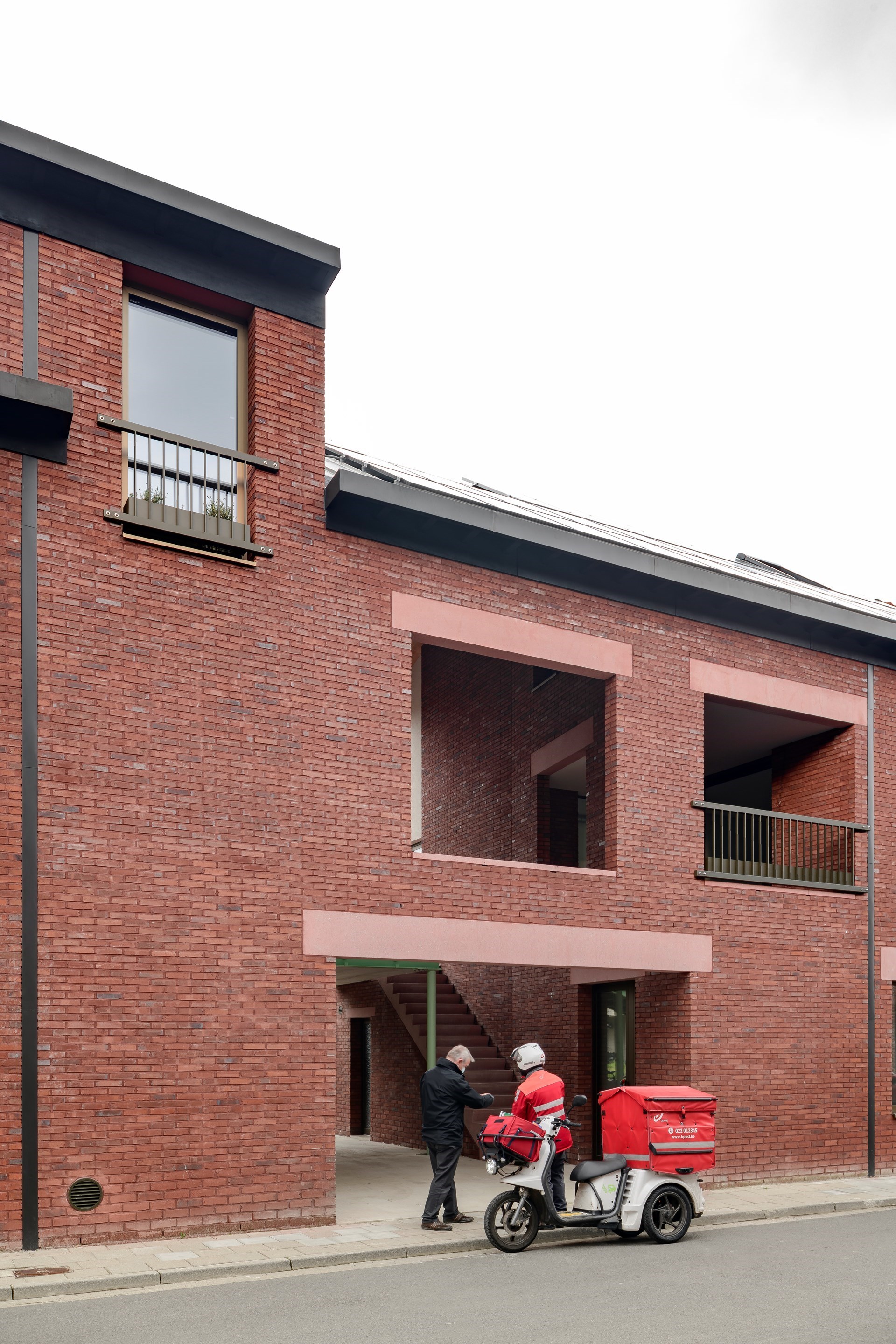 Carton123 architecten herneemt de verticale onderverdeling die zo typisch is voor de tegenoverliggende arbeiderswoningen, zij het niet letterlijk en iets complexer gepuzzeld. De nieuwe voorgevel durft de passant op het verkeerde been te zetten. Ondanks deze complexe puzzel van typologieën – gelijkvloers wonen volgens de principes van levenslang wonen, twee grote duplexwoningen met collectieve toegang, en een rijwoning - en gedeelde ruimtes werd steeds het evenwicht bewaard tussen gemeenschapsgevoel en de nodige privacy voor de bewoners.