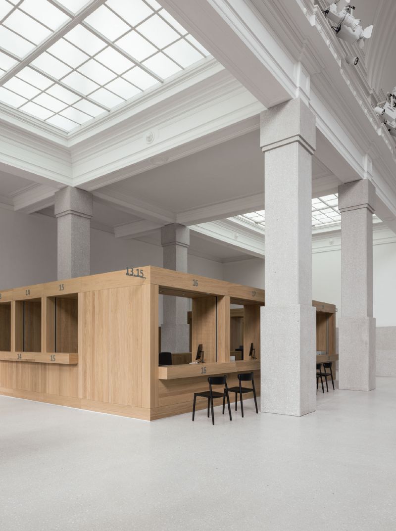 Een centrum voor dienstverlening aan de burger vereist specifiek meubilair. Het interieur moest worden aangevuld met servicepunten, praatcabines en balies voor ontmoetingen met burgers. Er werd meubilair in licht eikenhout ontworpen dat past bij de klassieke stijl van de hal. De werkplekken kunnen worden afgesloten als dat nodig is, bijvoorbeeld tijdens een concert. Sommige van deze inrichtingselementen en de extra benodigde banken kunnen gemakkelijk worden verplaatst. De overige ruimten binnen het complex zijn ontworpen met eikenhouten vloeren en gecombineerd met zo terughoudend mogelijk meubilair en gordijnen om het ruimtelijk effect en de interactie met de buitenruimte te benadrukken.