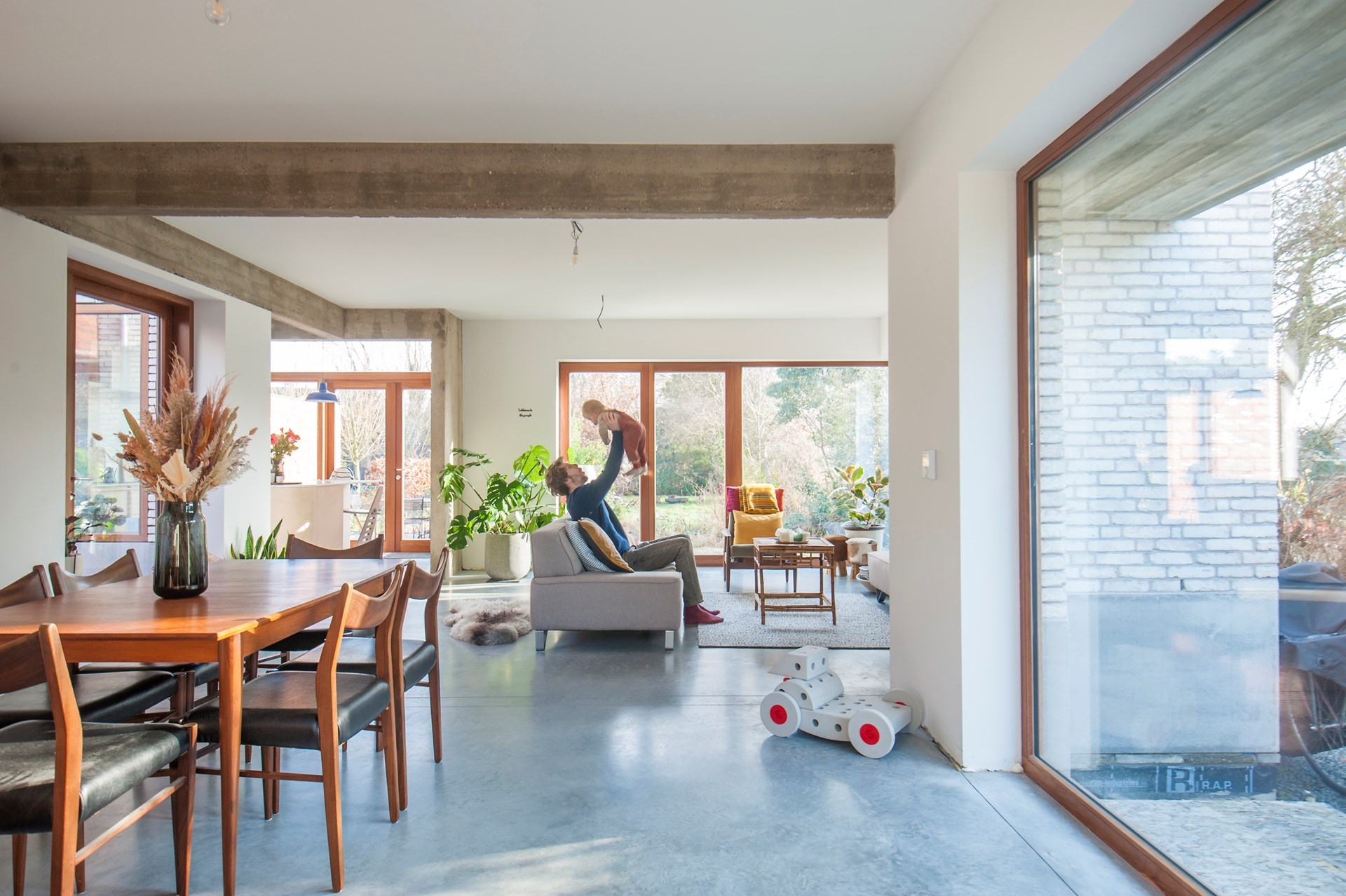 Een halfopen woning uit de jaren '60 vroeg om een grondige renovatie met uitbreiding. De bestaande koterijen werden afgebroken op het gelijkvloers en een nieuwbouw werd toegevoegd. Deze uitbreiding biedt de mogelijkheid voor de opdrachtgevers om hun slaapkamer op het gelijkvloers te voorzien. Een ruwe structuur in beton werd toegevoegd en takt aan op een centrale patio in het nieuw volume. De keuken, gelegen langs de tuinzijde, heeft zijn eigen vormentaal met zadeldak op kleine schaal en knipoog naar wat ooit was. Alle woonruimtes situeren zich rond de patio. Het betreden van de woning gebeurt onder een betonnen luifel die de bezoeker reeds een glimp biedt van de gekozen materialen in de woning. De witte gevelsteen rust op een betonnen plint die de contouren van het nieuwe volume volgt. De houten ramen in afzeil zorgen voor een warme uitstraling, zowel binnen als buiten de woning.