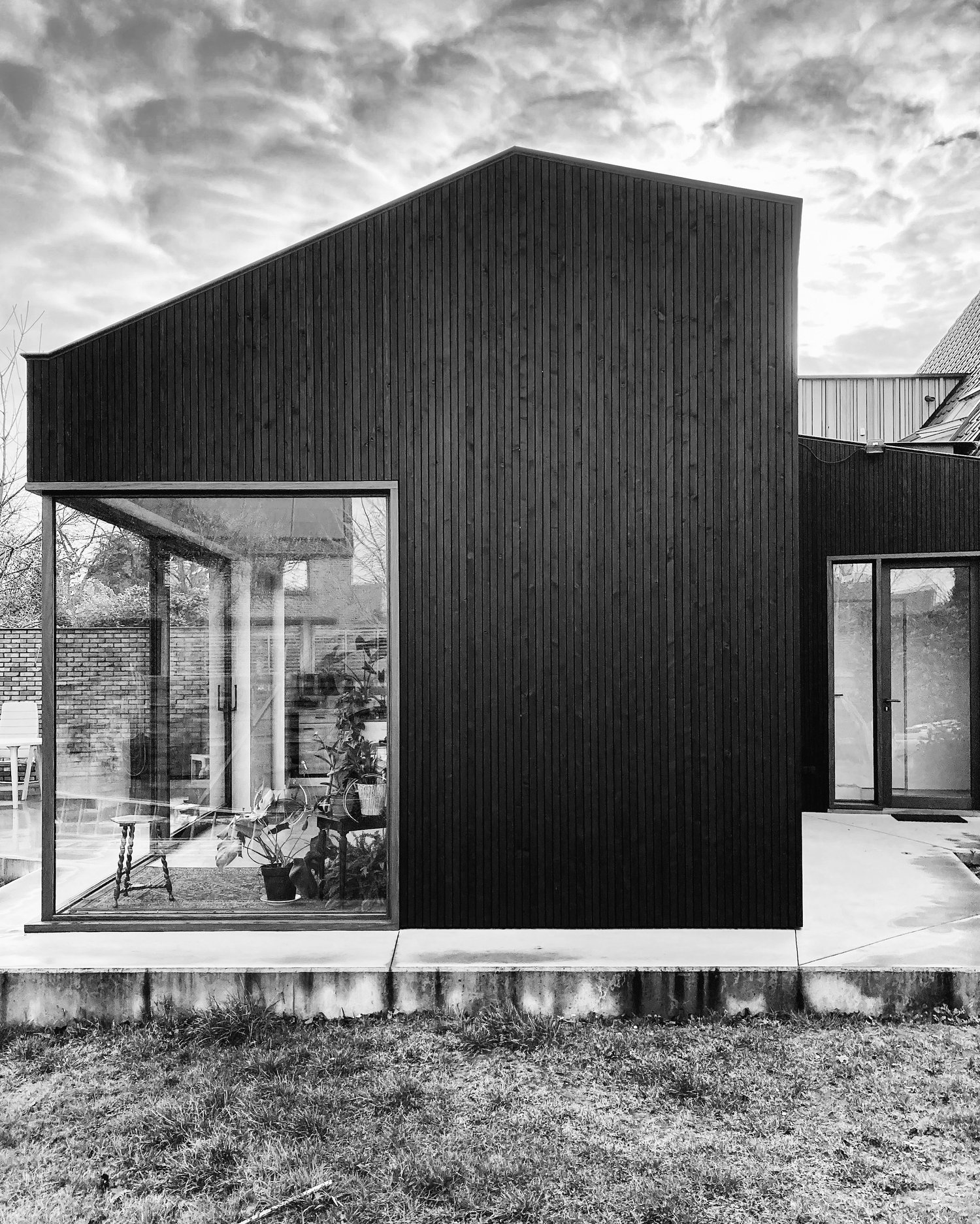 De renovatie en uitbreiding van een halfopen woning voor een jong koppel bood de kans om een atypisch maar omarmend volume toe te voegen aan de bestaande woning. Door de bestaande hoogte van de scheidingsmuur kon er voor een gabarit van het nieuw volume worden gekozen dat schuin oploopt naar een L-vormig volume met asymmetrisch zadeldak. De L-vorm zorgt ervoor dat de toegang tot de woning zich kan situeren tussen het nieuwe volume en de bestaande woning: als het ware een open en rustige buitenruimte die de bezoeker centraal in de woning leidt. Vanuit de eetkamer in het nieuwe volume hebben de bewoners zicht op de tuin, voortuin en de inkomzone van de woning. Door de planvorm krijgt deze ruimte ook daglicht vanuit verschillende oriëntaties.
