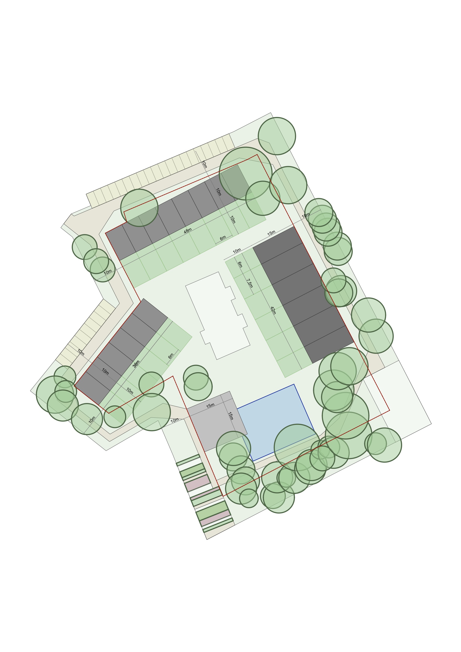 In deze cohousing situeren de woonentiteiten zich langs de randen van het terrein, waarbij terrassen en private tuinen zich richten naar het groene binnengebied. Compact bouwen is voor de ontwerpers een must en tegelijkertijd een kans om het bestaande groen op de site zo optimaal mogelijk te betrekken bij de intimiteit van het wonen. Autoverkeer op het terrein wordt geweerd aan de toegang van de site aangezien parkeren enkel daar mogelijk is. Een groene en semi-verharde ontsluitingslus vormt vanaf daar dé zachte verkeersader op het terrein, die alle functionele zones (woningen, paviljoen, speelzones, moestuinen,...) verbindt, maar eveneens toegankelijk zal zijn voor hulpdiensten. Cohousing betekent gedeeld wonen. Hiervoor zijn (flexibele) ruimtes nodig die het collectieve woonprogramma een meerwaarde aanbieden en een gelijkaardige huiselijkheid uitstralen.