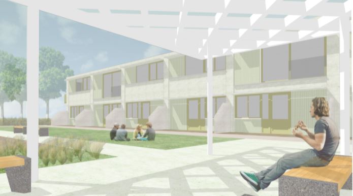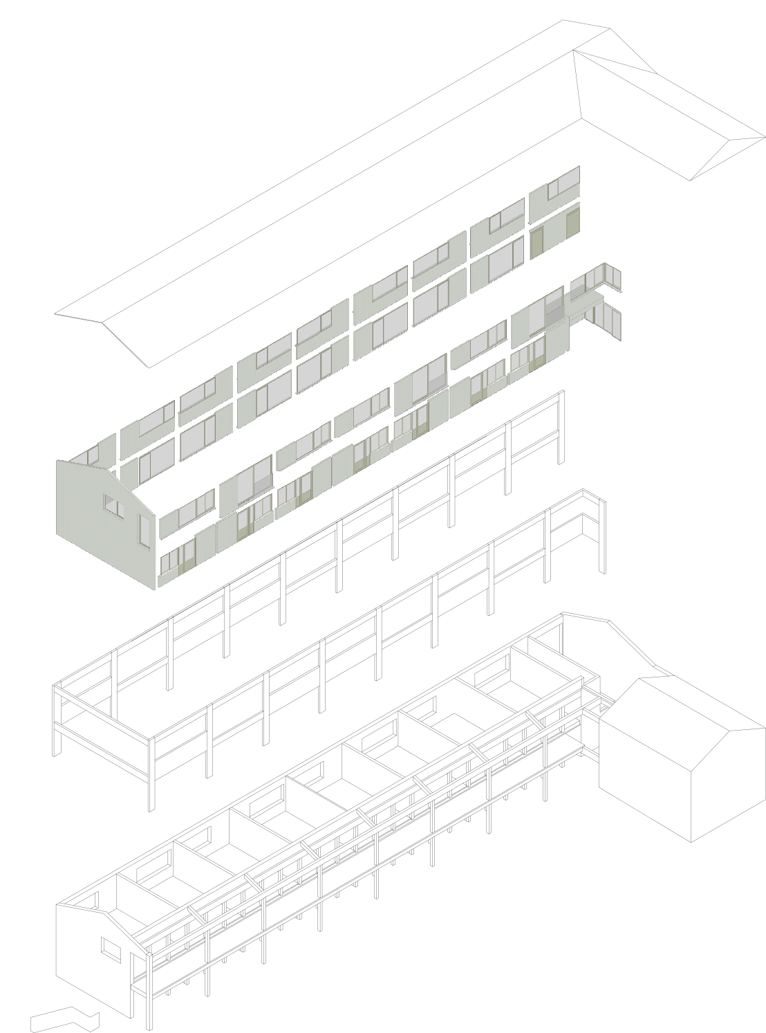 Moyaert Van Buyten architects maakte deze vijftien sociale woningen futureproof, zowel voor de gebruikers als op energetisch vlak. Het gebouw werd volledig gestript tot op de bestaande ruwbouwstructuur en voorzien van een nieuwe technische uitrusting. De gevel werd volledig geïsoleerd en bekleed met betonnen, gezandstraalde prefabpanelen, waarbij de ritmiek de oude structuur volgt. Het gebouw is nu klaar om te verwarmen op lage temperatuur. Voor de gebruikers werd een duidelijk leesbare omgeving gecreëerd. De studio’s zijn ontworpen als doorzonunits.