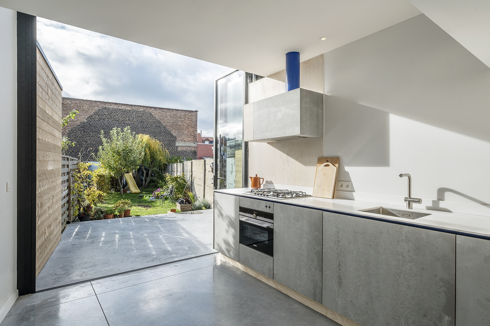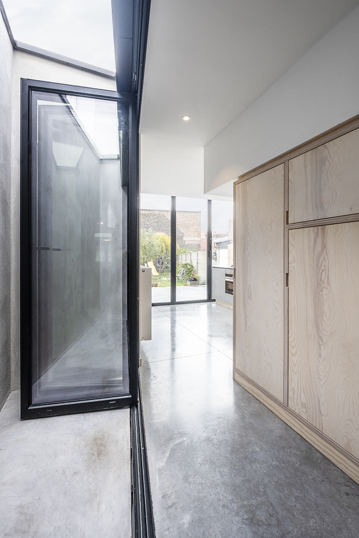 De bestaande bebouwing van deze rijwoning in Vilvoorde bestond uit een aaneenschakeling typische Vlaamse koterijen waardoor er weinig daglicht toetrad tot de leefruimte en de verbinding met de tuin onbestaande was. De opdracht was om met beperkte middelen de tuin te betrekken bij de leefruimtes en natuurlijk licht zo ver mogelijk naar binnen te trekken. Het ontwerp draait rond het introduceren van een keuken aan de tuin die volledig omgeven is door buitenlucht. Dit zorgt ervoor dat op zomerse dagen de grens tussen binnen en buiten volledig vervaagt. Door het introduceren van een patio, waar vroeger de keuken was, is er ook ter hoogte van de leefruimte een verbinding met buiten en wordt deze overspoeld met natuurlijk licht. De grote glaspartijen zijn voorzien van een vouwraam zodat bij goed weer die grens tussen binnen en buiten nog meer vervaagt.