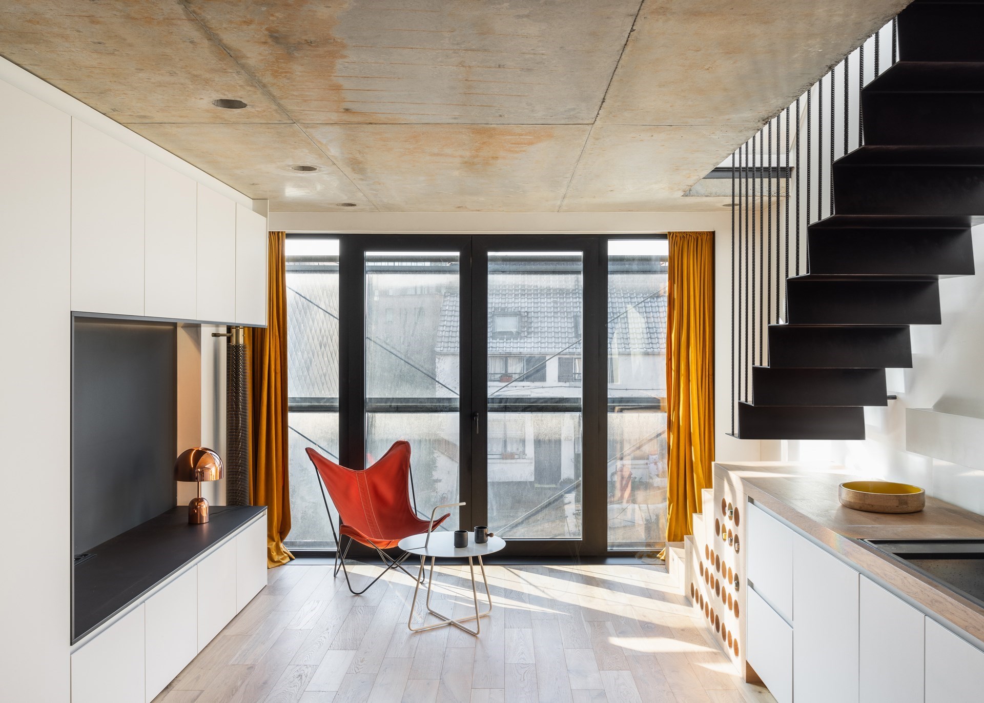 Halverwege de middag schijnen de eerste zonnestralen het volume binnen. Hierdoor besloot de architect om de straatkant volledig te openen, de enige oriëntatie die zorgt voor direct licht en een diep uitzicht op het landschap. Het directe en diffuse licht wordt geregeld via een dubbele wand van ijzer en glas, die overigens de strijd aangaat tegen oververhitting, verblinding, voldoende privacy en het uitzicht.