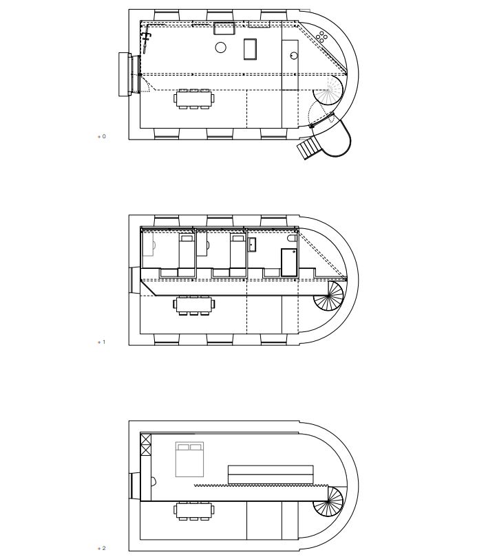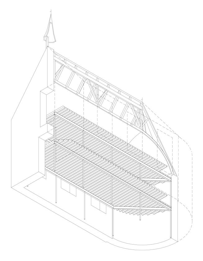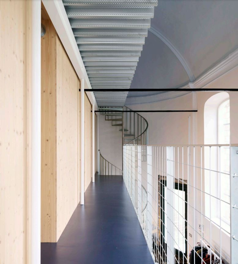Twee geprofileerde stalen tussenvloeren kragen uit over een portiekstructuur op de middenas van de kapel. De aannemer sneed ze precies bij waardoor het halfronde koor, de oude voordeur en een ranke spiltrap de verschillende verdiepingen met elkaar verbindt. Een enkele deur in het koor breekt het gesloten karakter van de kapel en zorgt voor een uitzicht op de achterliggende velden.