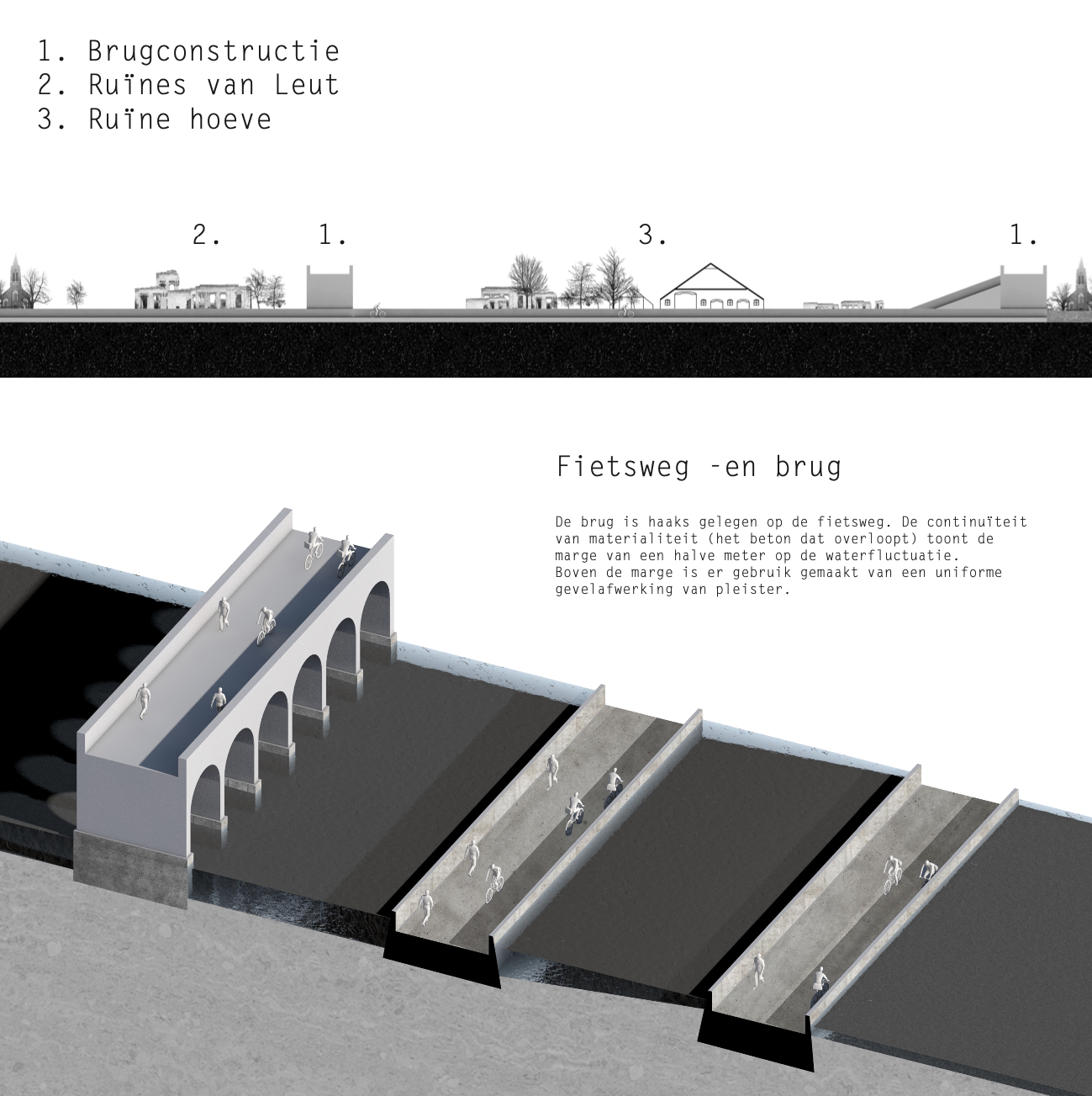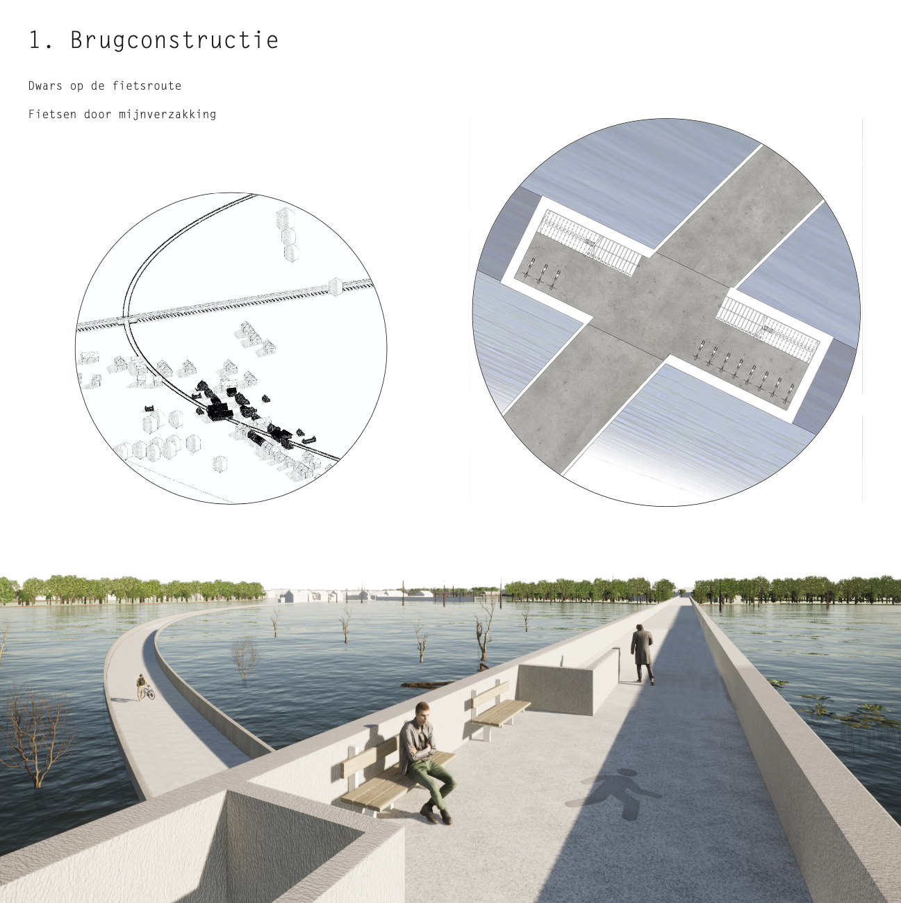 Maar het project brengt ook ruimtelijke opportuniteiten met zich mee, zoals recreatieve activiteiten binnen het ondergelopen landschap. Zo liet Olivier zich inspireren door bestaande recreatieve landschapsprojecten zoals ‘Fietsen door het water’ in Bokrijk of het nabijgelegen Kruinenpad, waar je als bezoeker de mijnverzakking van Eisden kan ervaren. Bij het ontwerp van Olivier Dochez zou de mijnverzakking aangetoond worden aan de hand van het onbewoonbare deel van de dorpen en diens ruïnes. De route vormt bovendien een verbinding van het dorpsplein van Leut met Meeswijk.