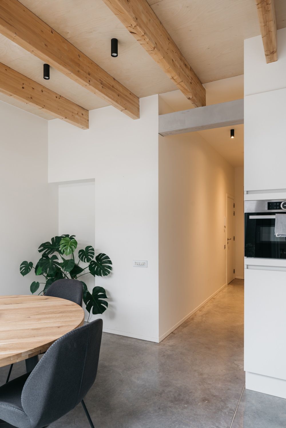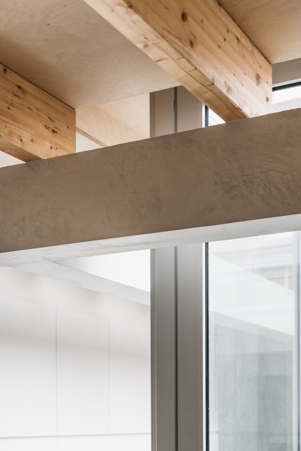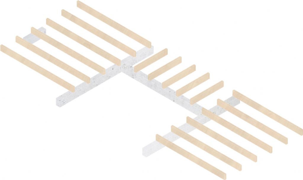 De zwevende dakconstructie is het belangrijkste architectonische element van de nieuwe uitbreiding. Ook daar is er veel aandacht besteed aan de materiaalkeuze. Betonnen balken ondersteunen de houten Glulam-balken die op hun beurt het plafond uit berkenmultiplex dragen. De balken zijn zodanig geplaatst dat het daglicht tot diep in de leefruimte kan doordringen. De naakte, lichte materialen zorgen daarbovenop voor een maximale lichtreflectie.