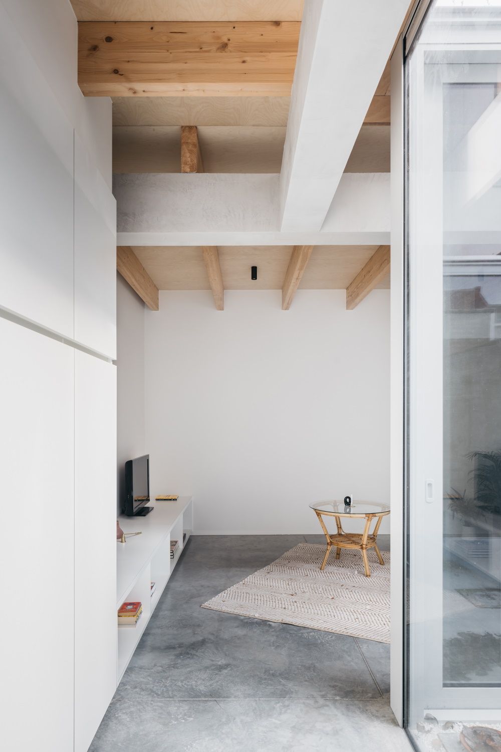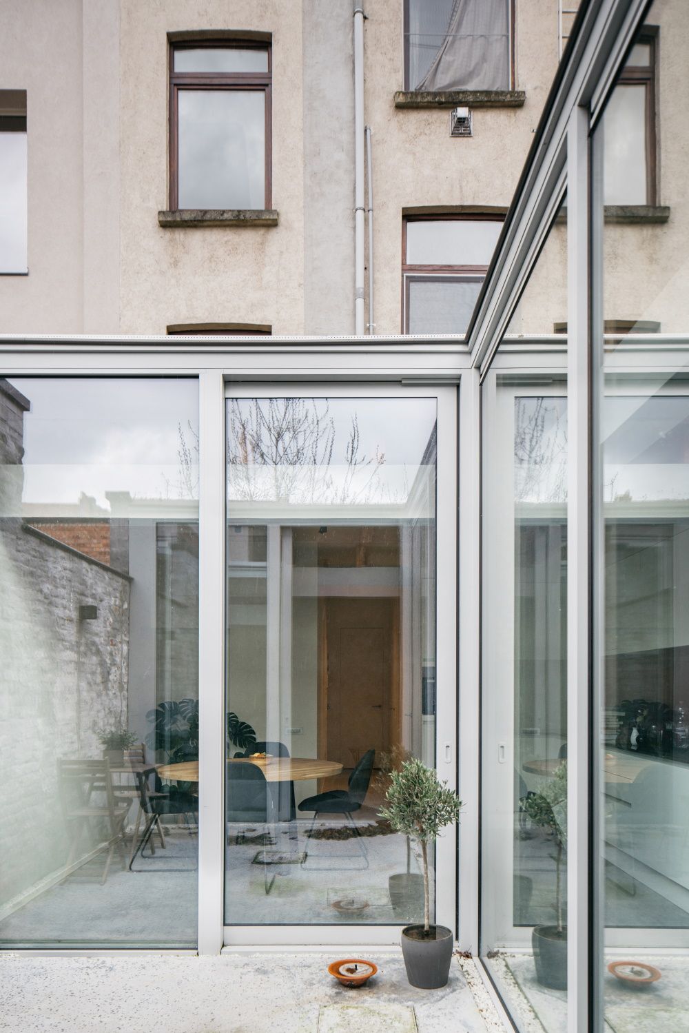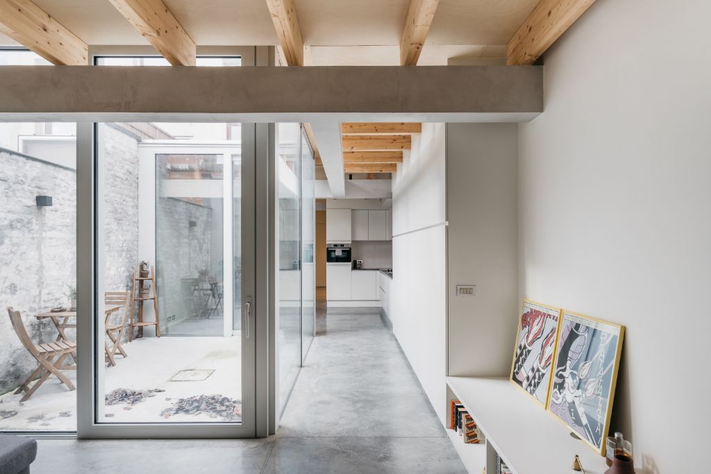Dankzij de afbraak van het oude bijgebouw konden Louis en De Pauw met een schone lei beginnen. Het resultaat is een leefruimte met een luchtige en ruimtebepalende patio. De centrale ligging en de drie meter hoge ramen maken van het binnenplaatsje van 9 m2 een volwaardige buitenruimte. Het materiaal en de hoogte van de vloer zijn zowel binnen als buiten hetzelfde. Dat zorgt niet enkel voor eenheid, maar maakt ook dat de patio vloeiend overgaat in de leefruimte binnen. De patio bepaalt de ruimtes, maar werkt tegelijkertijd verbindend doordat deze volledig beglaasd is. Er blijft steeds een relatie met alle leefruimtes, ondanks de afstand.