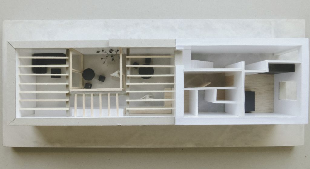 De indeling van het appartement is volledig omgewisseld. Het slapen, dat oorspronkelijk helemaal achteraan de woning gebeurde, verplaatste Louis naar de voorgevel. De leefruimte kwam op haar beurt achteraan de woning te liggen. Zo herbergt het oorspronkelijke gebouw aan de straatkant nu de private functies zoals slapen en baden en zijn de semi-private functies te vinden in het nieuwe bijgebouw. Het oude moest door onder andere vochtproblemen volledig afgebroken worden.