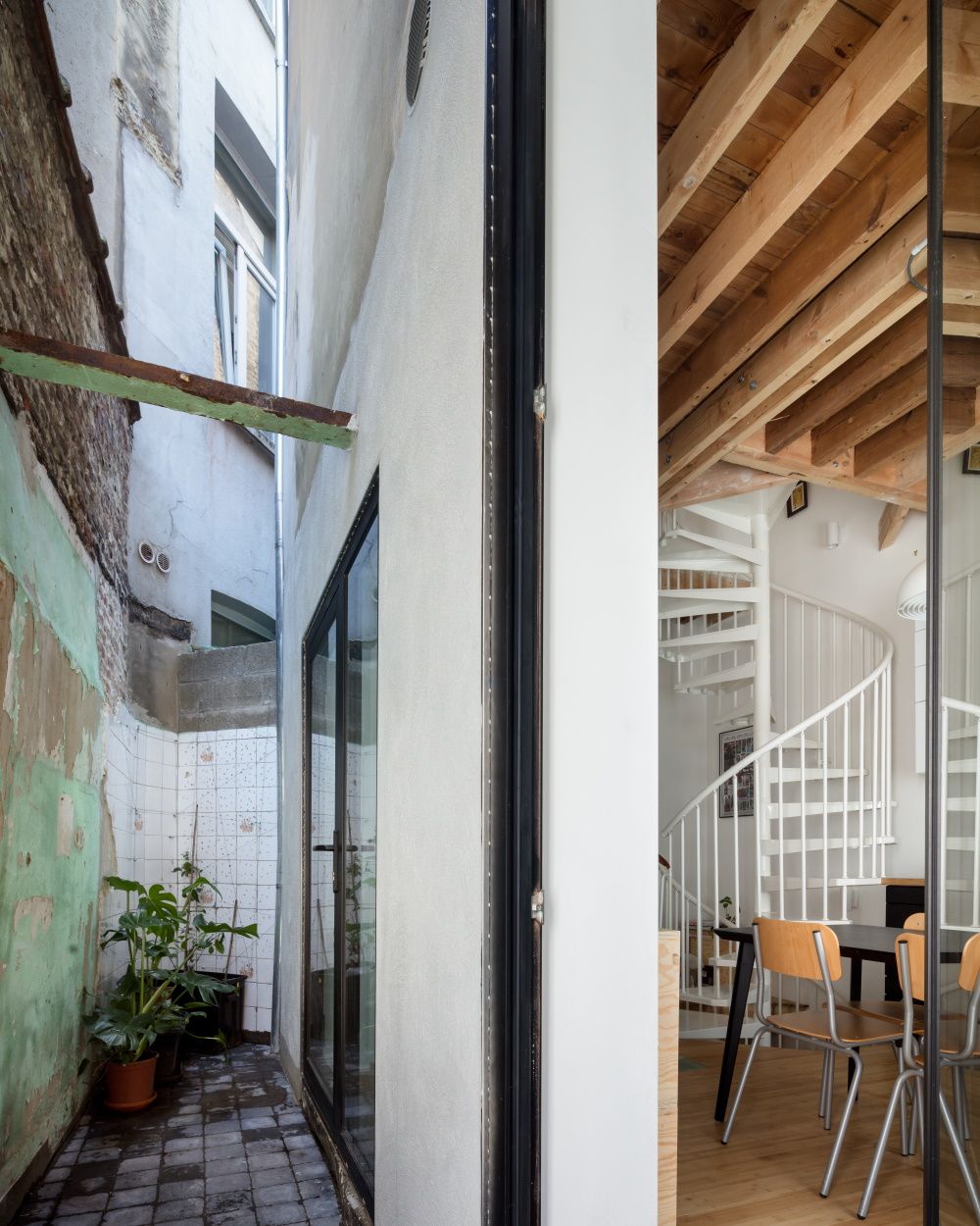 Een wenteltrap verbindt de verschillende verdiepingen van vijftien vierkante meter met elkaar. Elke verdieping krijgt daardoor niet enkel een eigen functie, maar wordt ook echt een aparte kamer met een eigen sfeer. In het bestaande volume van de woning bevinden zich de dagfuncties. De badkamer is gesitueerd in de kelder, de keuken op het gelijkvloers en de woonkamer op de eerste verdieping. Die laatste leefruimte heeft een erker en doet dienst als een meer private bel-étage. De keuken staat dan weer in nauw contact met de straat.