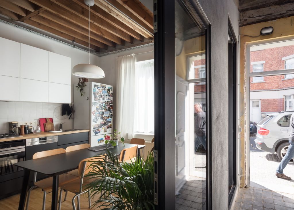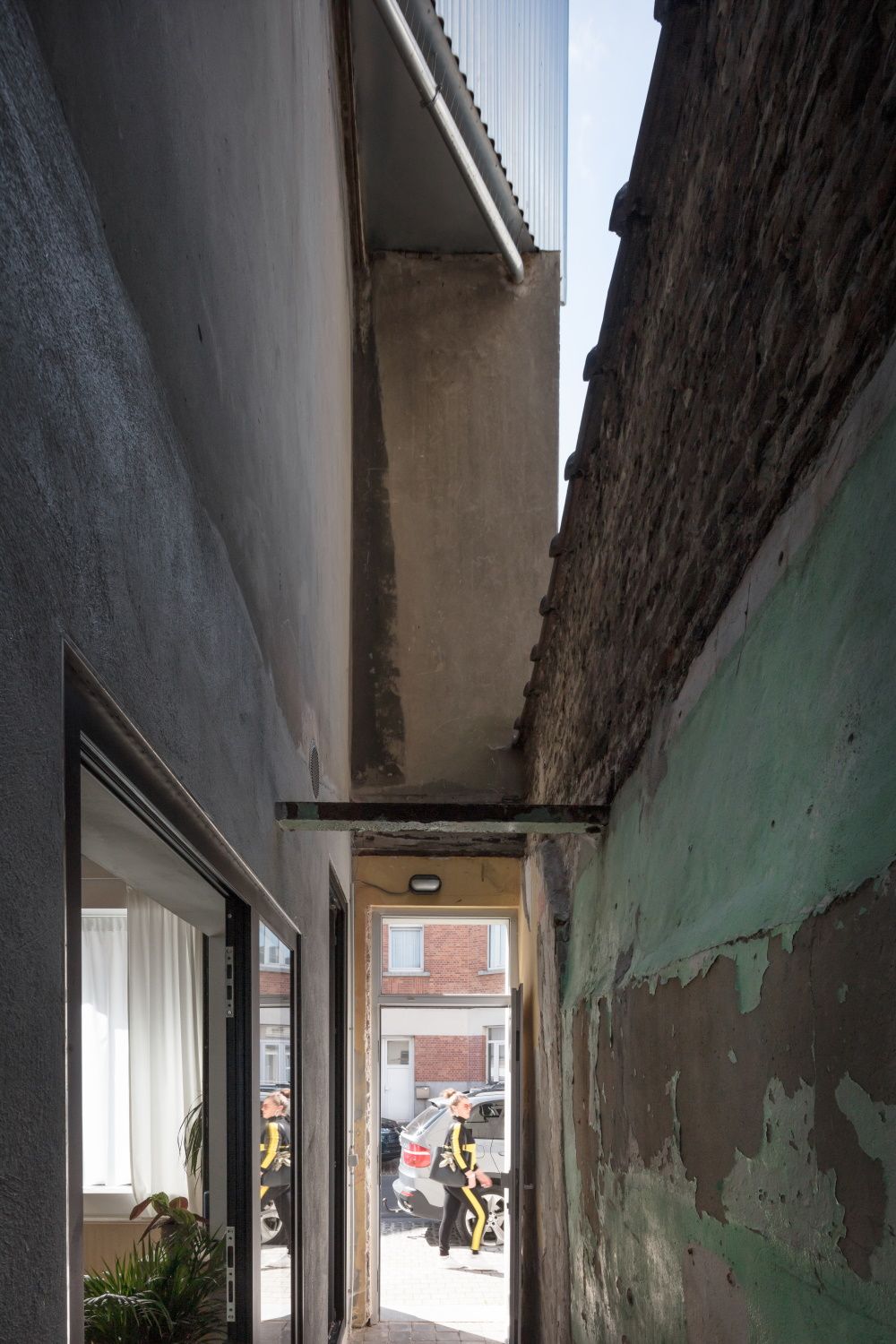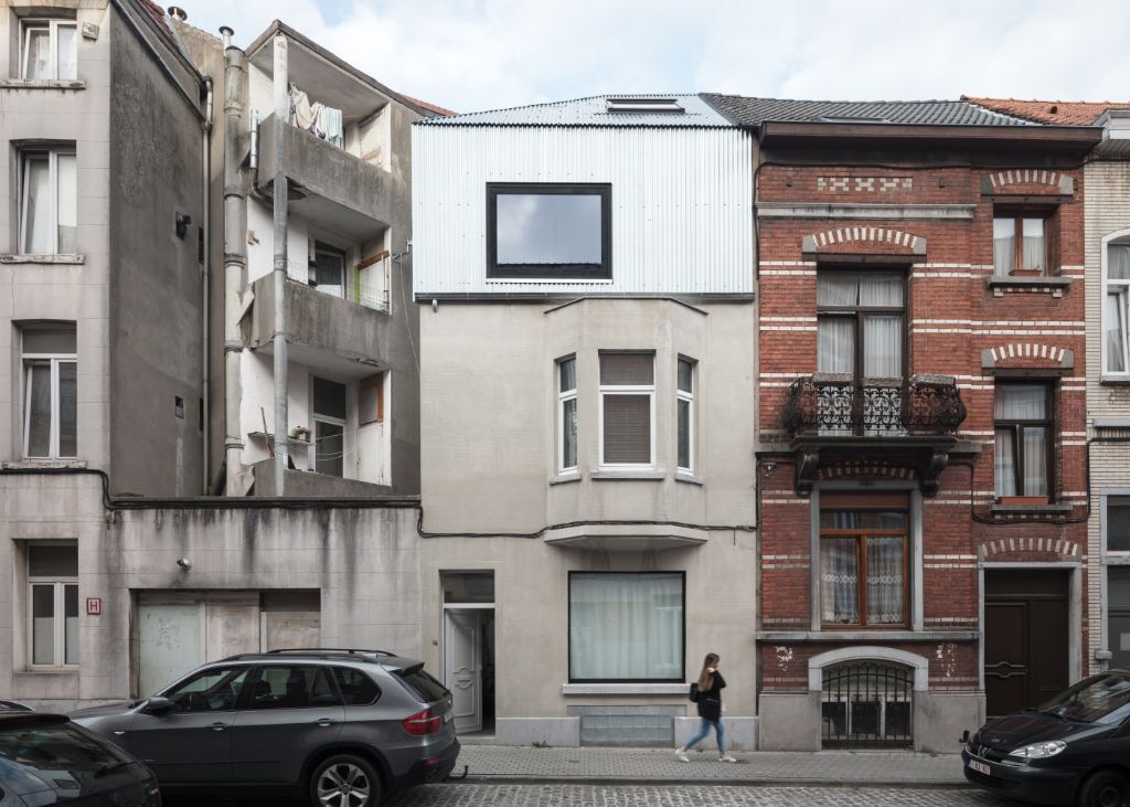 Geschrankt tussen terrassen, achterkanten en kleine koertjes is de locatie van deze woning te Koekelberg zo Brussels als maar zijn kan. Zijn gekke kadasterale indeling en woelige geschiedenis - eerst volière, daarna garage, dan weer werkplaats en tenslotte woning – zorgen voor een grillig perceel met weinig beschikbare buitenruimte. Om de woning bewoonbaar te maken voor een jong koppel en voldoende daglicht binnen te trekken, koos Label architecture ervoor om twee verdiepingen toe te voegen bovenop het oorspronkelijke volume. Het resultaat is bijna een verdubbeling van de oppervlakte van de woning. Het hoofdgedeelte van het gebouw braken de architecten spaarzaam af en ze sloopten ook een klein volume op het gelijkvloers om een buitenruimte te voorzien. Die uitwendige opening komt overeen met de voormalige erfdienstbaarheid.