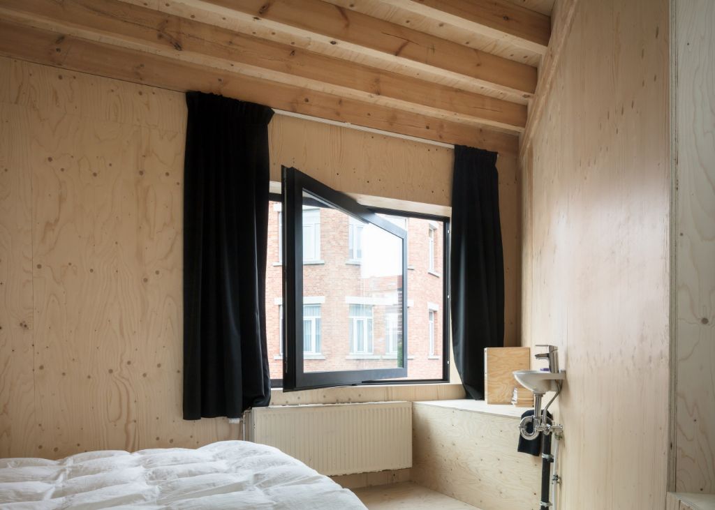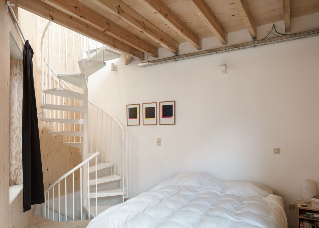 De slaapkamer en mezzanine zijn opgenomen in de uitbreiding. Een pivoterend raam maakt van de slaapkamer als het ware een stadsbalkon en zorgt ervoor dat de bewoners zelf kunnen kiezen hoeveel privacy ze willen. In de mezzanine onder het schuine dak kunnen de gebruikers al zittend lezen, maar krijgen ze ook een uitzicht op de benedenstad als ze rechtstaan.