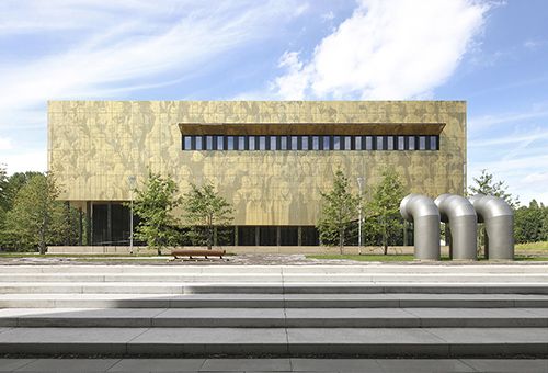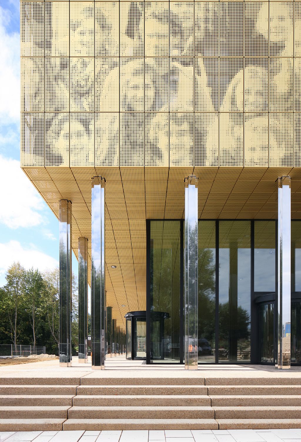 De groepsfoto werd op de gevel geponst in de goudkleurige aluminium gevelplaten. De afbeelding werd gerasterd in dots met vijf verschillende diameters. Door de CNC-techniek te gebruiken kan elk paneel op eenvoudige wijze uniek gemaakt worden. Het beeld is slechts leesbaar op grotere afstand. Op korte afstand krijgt men slechts een abstrahering van het beeld te zien.