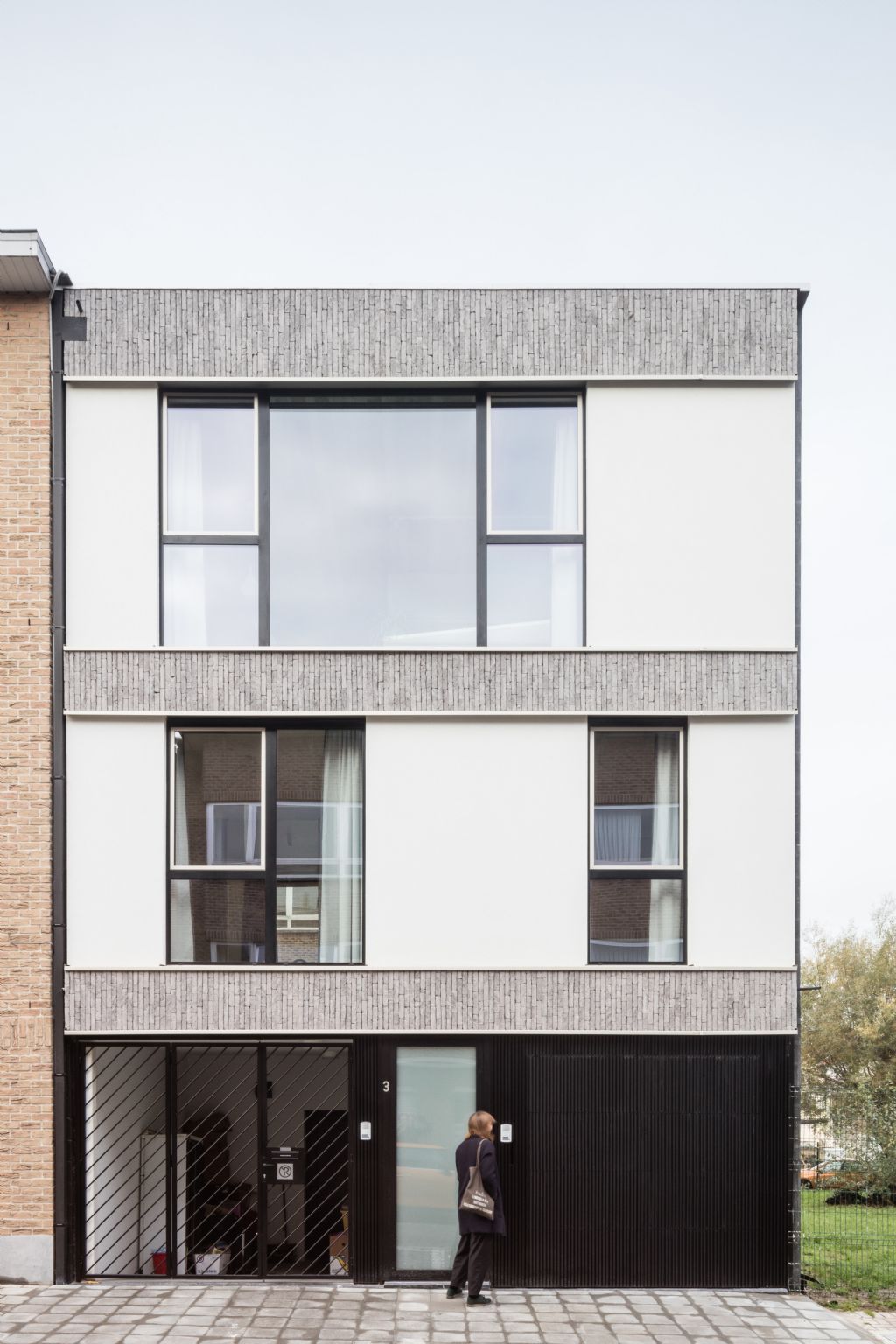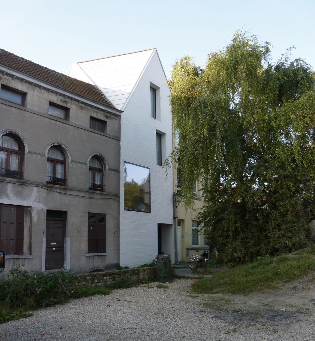 Passieve nieuwbouwwoning in een straatje met pastelkleurige arbeiderswoningen. Het volume werd zo vormgegeven dat het de afwijkende kroonlijsthoogtes van de naastgelegen gebouwen met elkaar verbindt. Door de voorgevel op te trekken met nieuwe en plaatselijk gerecupereerde bakstenen past het binnen deze historische context.