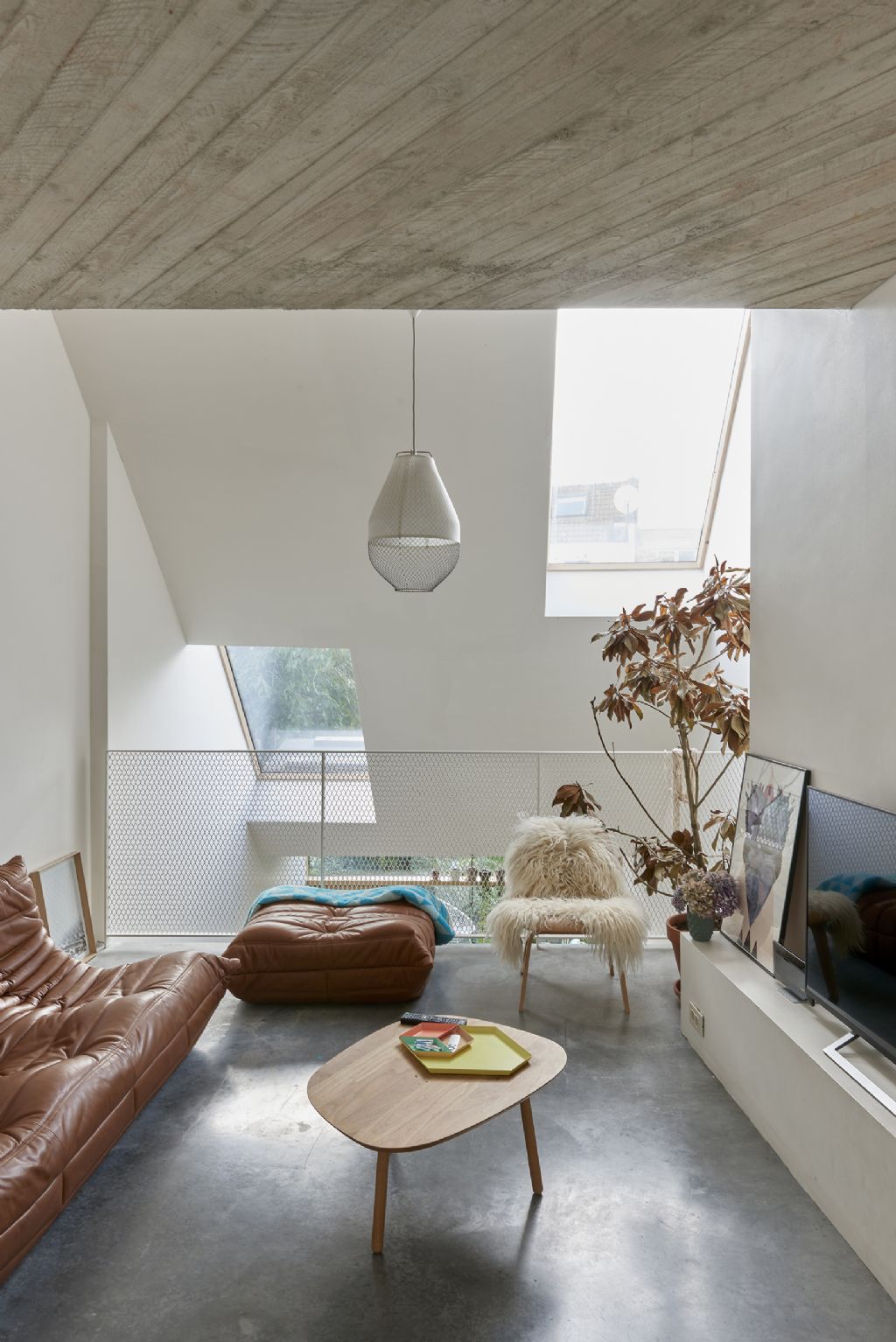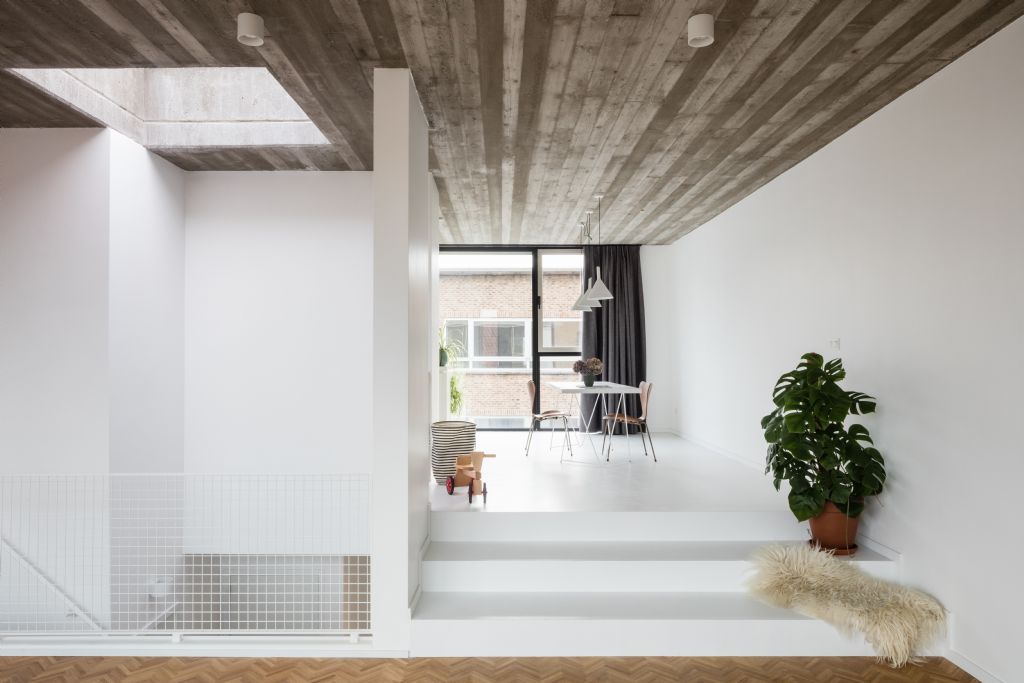 De woning is gebouwd op een perceel van slechts 3,5 meter breed. Hierdoor werd de leefruimte opgesplitst over twee niveaus waartussen een link bestaat door de vorm van de achterbouw. De circulatie staat centraal waardoor alle ruimtes van de maximale breedte kunnen profiteren.