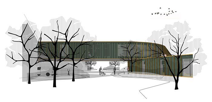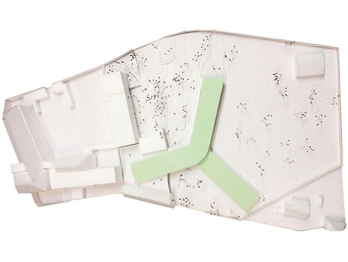 Het volume bestaat uit twee op elkaar gestapelde ‘boomerangs’. Elk been hiervan bestaat uit één leefgroep. Het staat zo ingepland dat elk been in relatie staat tot een van de drie elementen. Door de sterkte van de helling in het terrein te gebruiken, zorgen de ontwerpers ervoor dat alle gebruikers op hun leefniveau naar buiten kunnen zonder een lift of trap te moeten gebruiken.