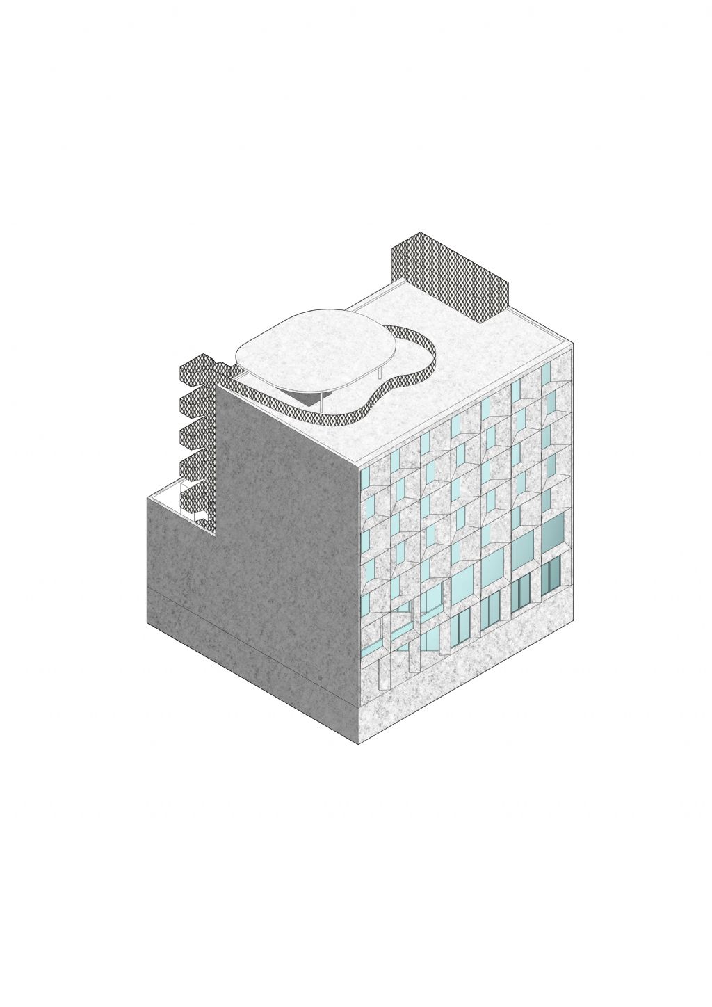 Om het gevraagde programma te kunnen integreren en het vloeroppervlak in het nieuwe gebouw te vergroten, is het volume ontworpen met ruimtes die over de straat hangen. Zo kon van deze grote zuidgevel worden geprofiteerd om hem tot leven te brengen en extra woonruimtes te creëren, in communicatie met de straat.