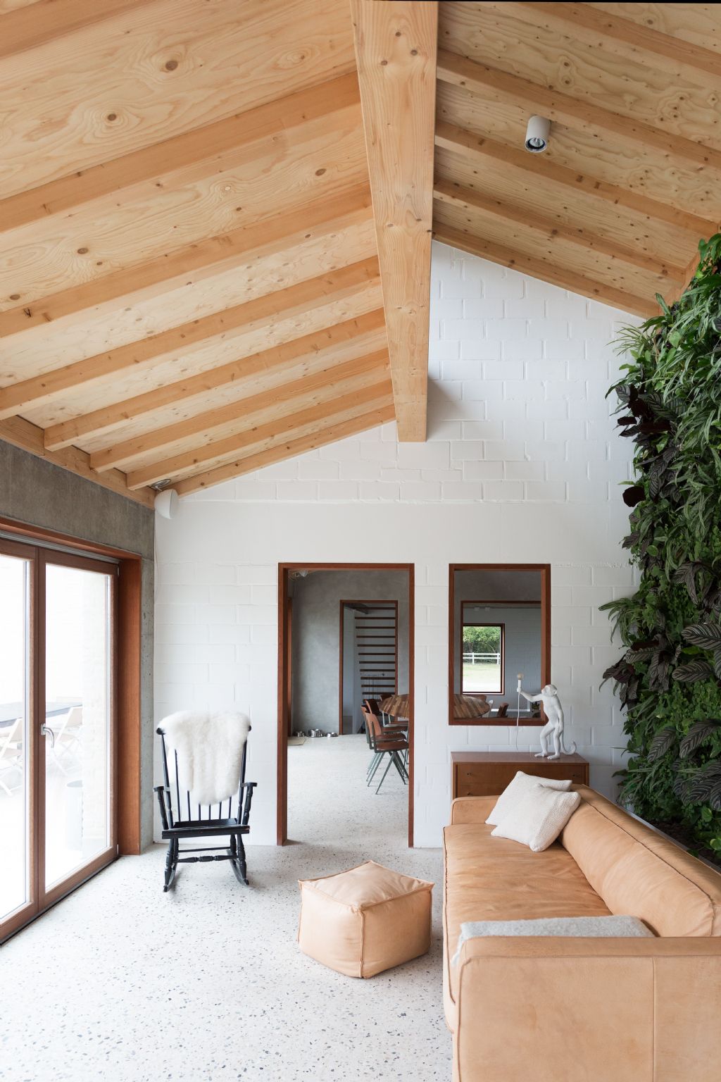 Voor die materialen zoeken ze aansluiting bij de dichtbijgelegen Latoene-hoeve. Daarnaast kiezen ze voor een leiendak en een lokale recuperatiebaksteen voor de gevel. Het ontwerp is een hedendaagse interpretatie van een archetypische langgevelhoeve en een voorbeeld van hoe Overal Architectuur omgaat met de geschiedenis.