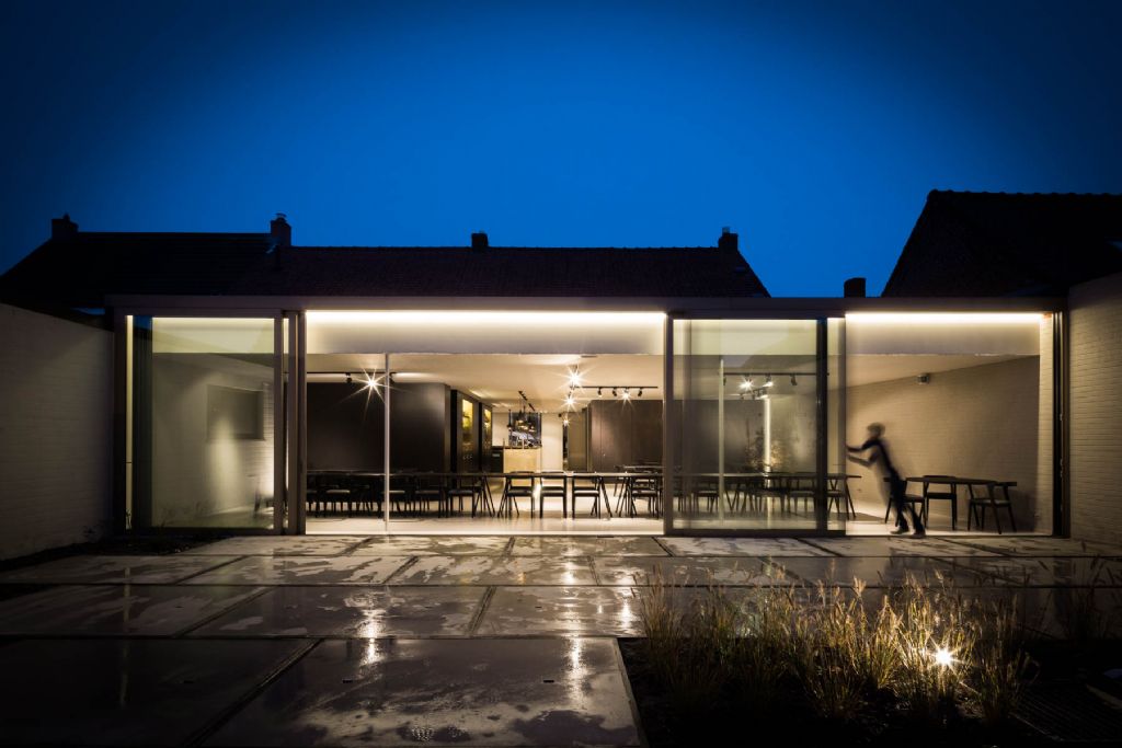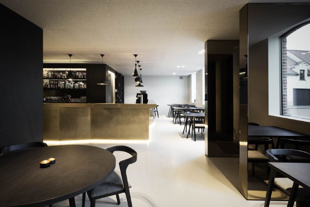 Het pand werd gerenoveerd om de relaties tussen het restaurant, het dorpsplein en het ommuurde terras te versterken. Dit hebben de ontwerpers gedaan door de verschillende ruimtes aan de voorgevel met elkaar te verbinden waardoor de relatie tussen de gasten en het plein versterkt werd. In de achtergevel werd een grote glaspartij gestoken die de binnenruimte drempelloos doet overgaan in het ommuurde terras. Door subtiele ingrepen met bronzen verborgen buitenschrijnwerk aan de voorgevel ligt de nadruk op de sterke vorm van het gebouw en zijn openingen.