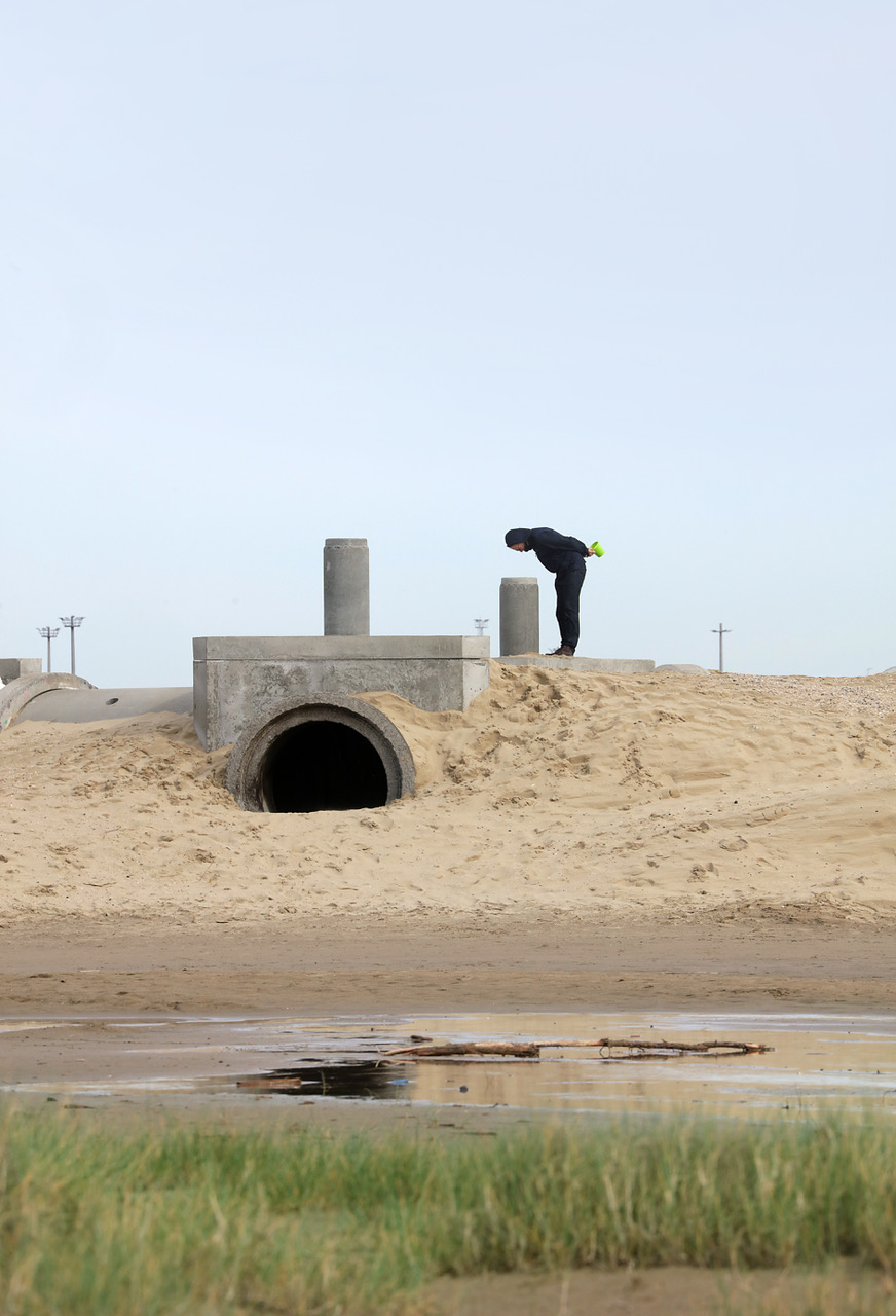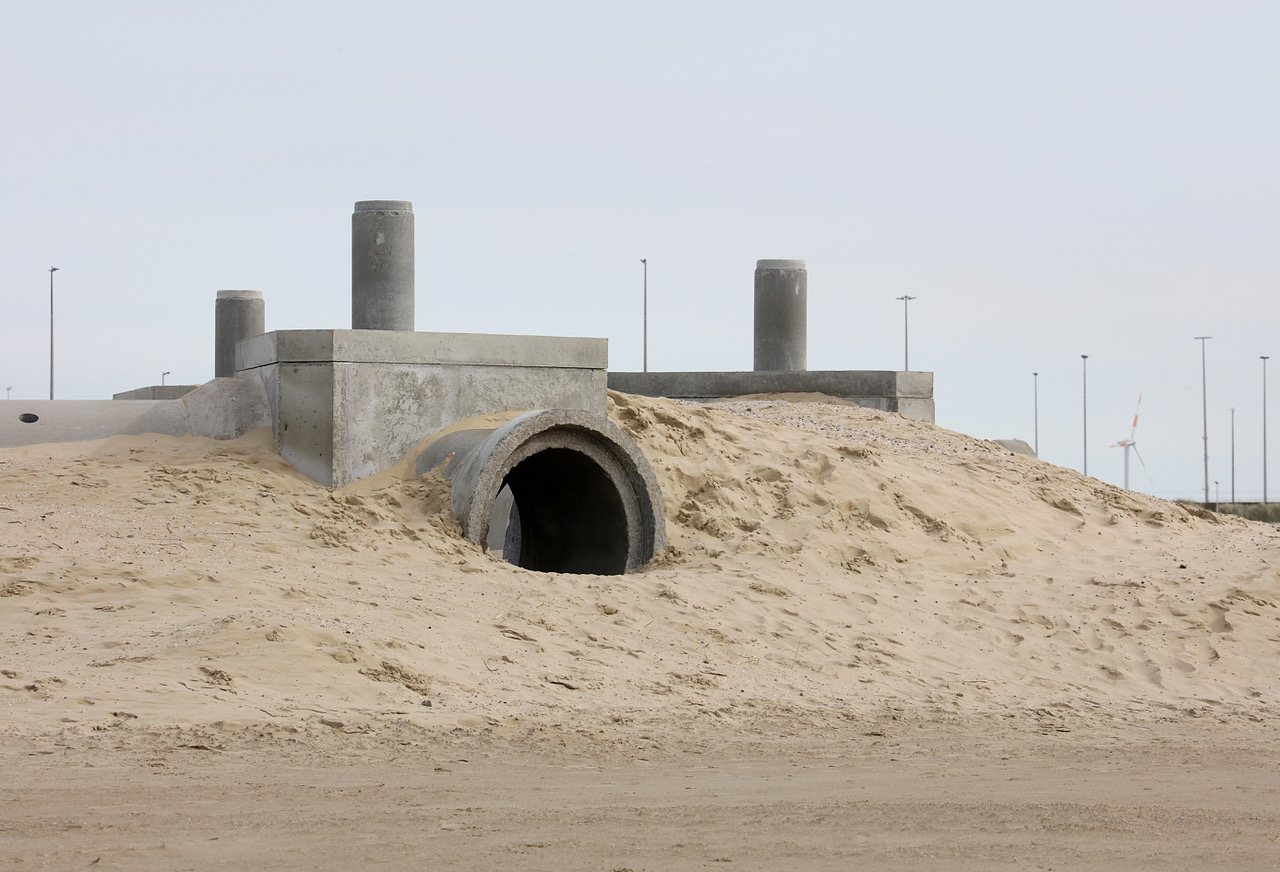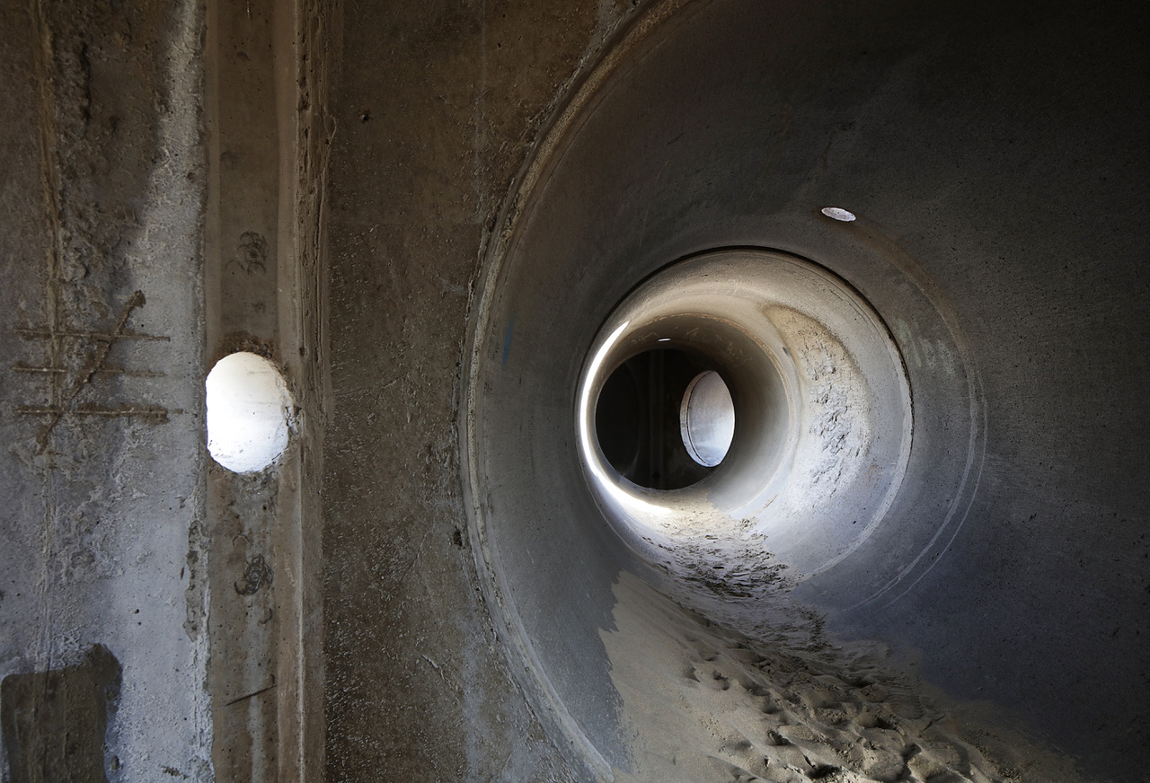Deze imposante structuur uit beton houdt het midden tussen een beeldhouwwerk en een gebouw. Het is opgebouwd uit cilindrische buizen, driehoekige inspectiekamers en modulaire onderdelen. De materialen verwijzen naar de industriële activiteiten in de streek en verborgen stadsinfrastructuur. Op de wanden van de installatie vallen verschillende markeringen en texturen op.