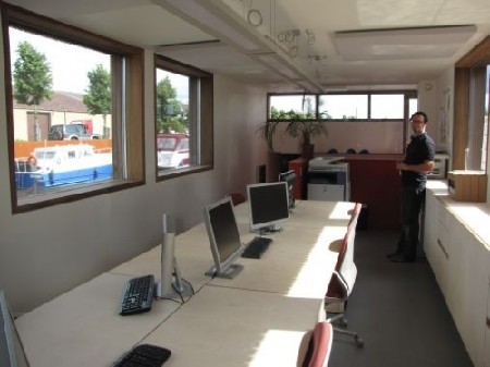 De kantoorboot is opgebouwd uit 2 niveaus: 1 bureau op niveau van het waterpeil en 1 bureau op niveau van de oever. Beide bureaus zijn afgescheiden door een centraal volume met daarin sanitaire voorzieningen, inkom en toegang tot de berging. In de neus van de boot, boven de vergaderzaal is plaats voorzien voor een zuiveringsveld. Achteraan de boot is er plaats voor een aparte keukeneenheid. Er is plaats op de boot voor 15 personen.