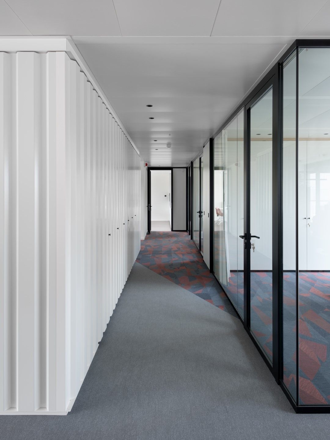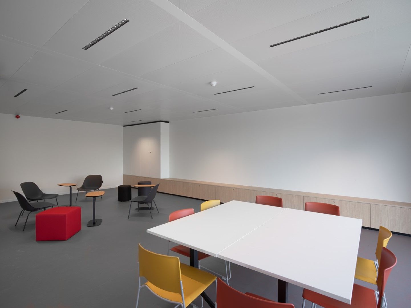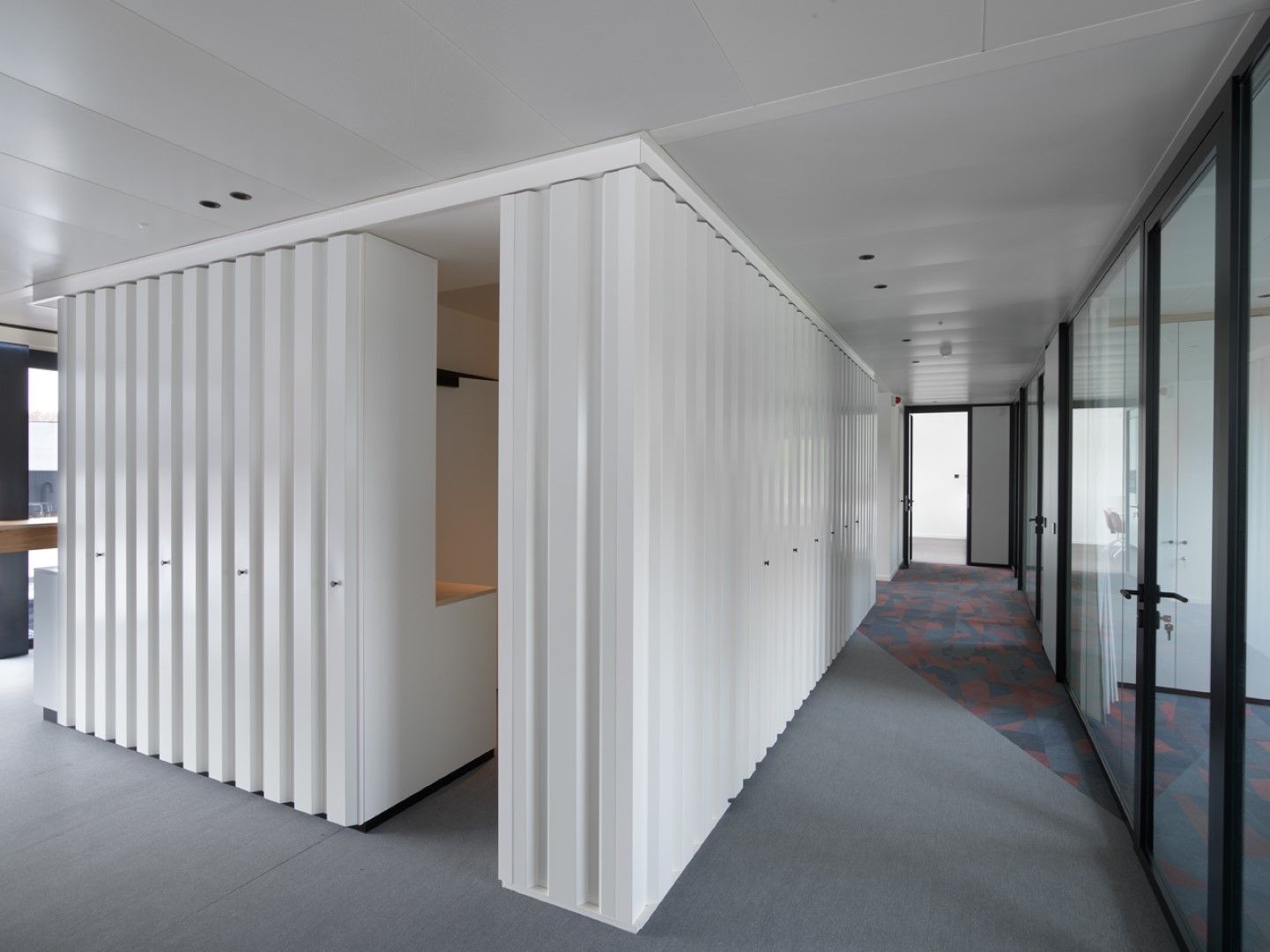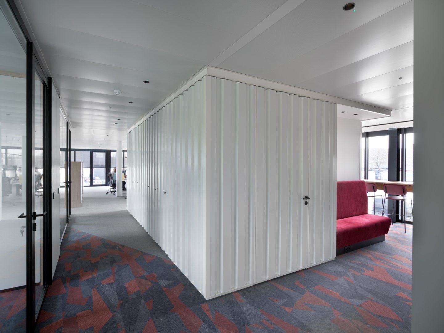 Voor dit project werd een totaalconcept neergezet. Naast onze systeemwanden (JB 2000 en JB 4000), gipskartonwanden en JB COOL klimaatplafonds stond Beddeleem ook in voor de vloerafwerking (tapijt, vinyl en tegels), het meubilair uit onze collecties JB LOCKERS, JB STORE en JB DESK, het maatmeubilair en schilderwerken.