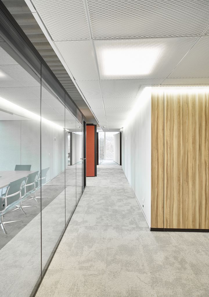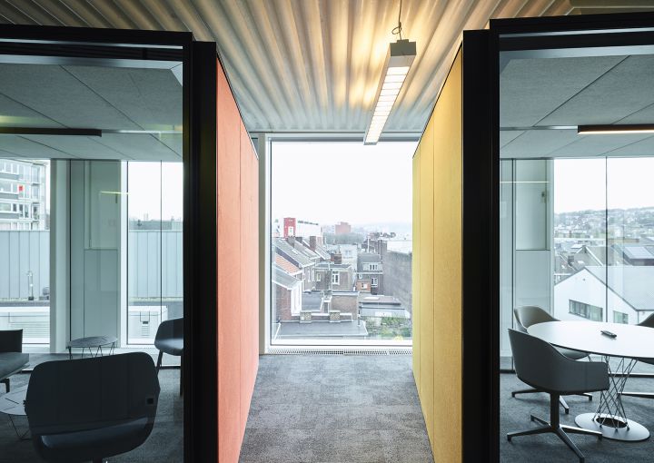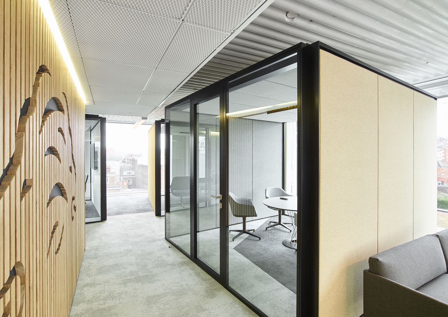 Voor Bluepoint implementeerde Beddeleem niet minder dan 7 producten, alsook afwerkingsoplossingen. Er werden werkruimtes van verschillende groottes gerealiseerd met JB QBE Modular en Flexible Bubbles, compatibel met verschillende scheidings- en plafondsystemen. In een van de hoofdruimten, waaronder een wachtkamer, werd de JB QBE gebruikt in combinatie met een JB PURE 50 enkelwandige scheidingswand en een JB 2000 stevige, met stof beklede scheidingswand.