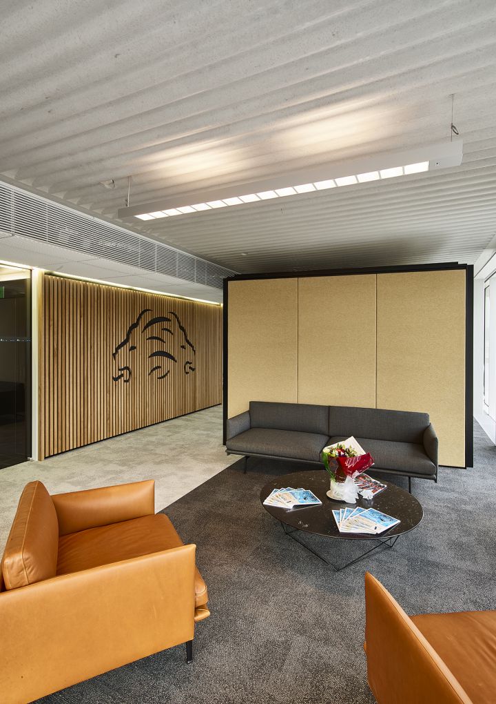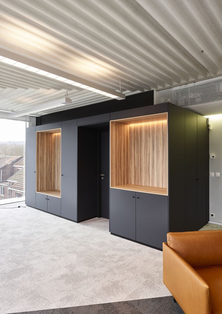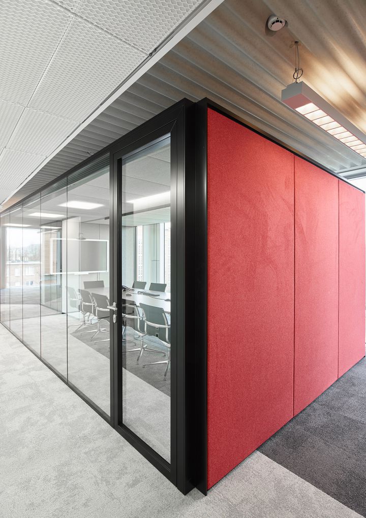 Deze ruimte werd ook verdeeld met het JB 2000 massief houten scheidingssysteem en een JB 4000 enkelvoudige beglazing. Op maat gemaakt akoestisch meubilair - inclusief JB STORE kasten - werd geplaatst en past perfect in het geheel. Tot slot zorgde Beddeleem voor de complete afwerking met valse vloeren, deuren, plafonds en schilderijen.