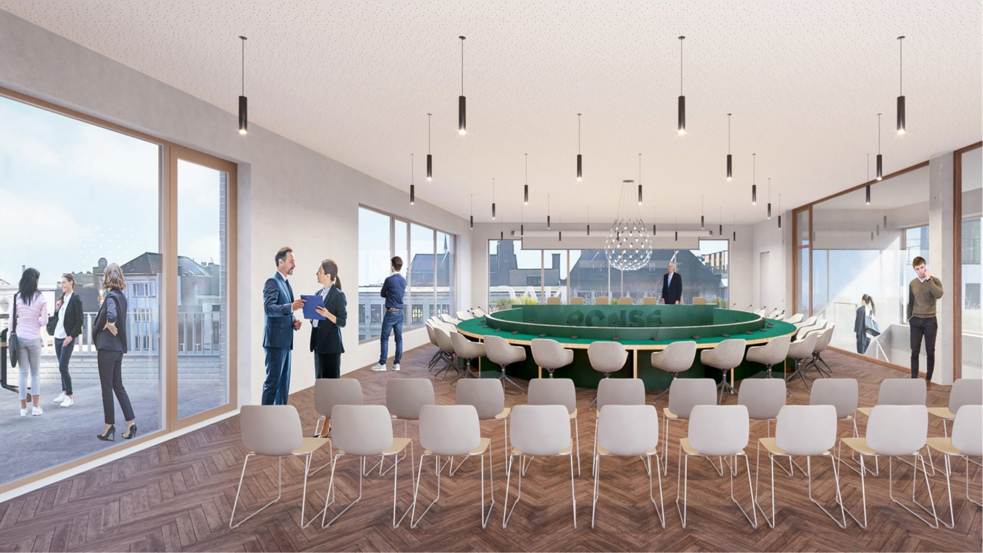 Via een ruim en licht atrium naar de kantoren en de cafetaria op de eerste verdieping worden het publiek en de administratie met elkaar verbonden. De vergaderzaal op de bovenste verdieping biedt een prachtig uitzicht op het centrale plein van Ronse. Het herinnert de stadsmedewerkers eraan dat ze het welzijn van de inwoners van Ronse dienen.