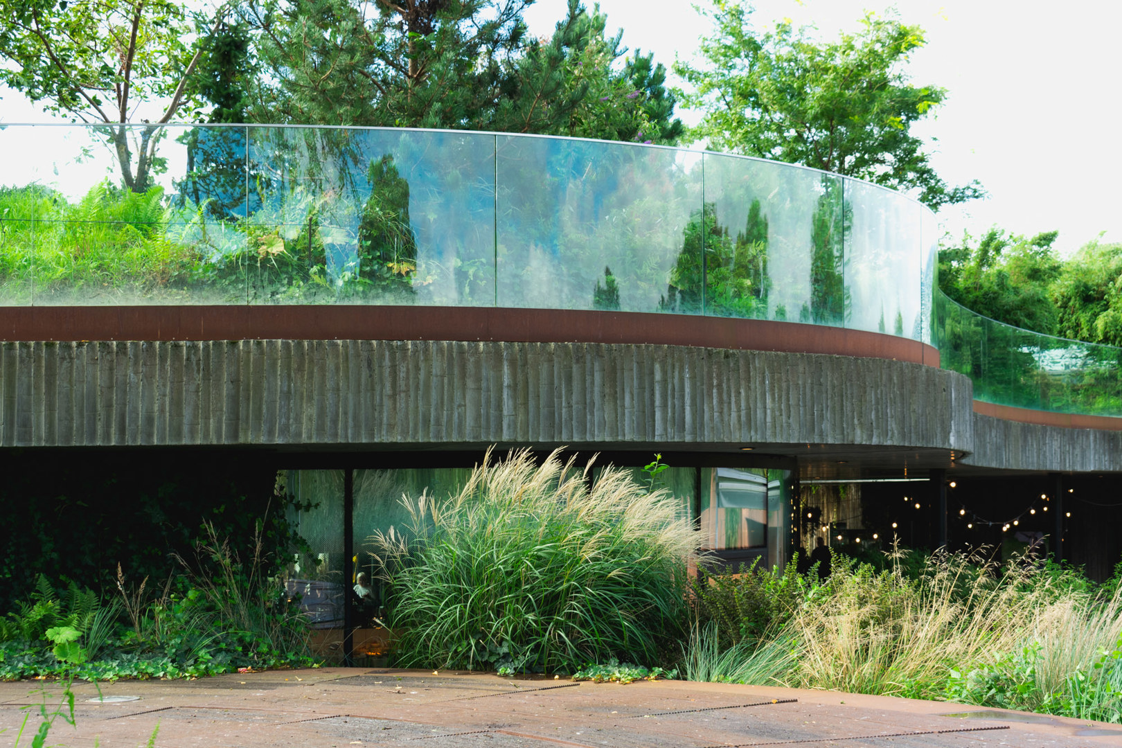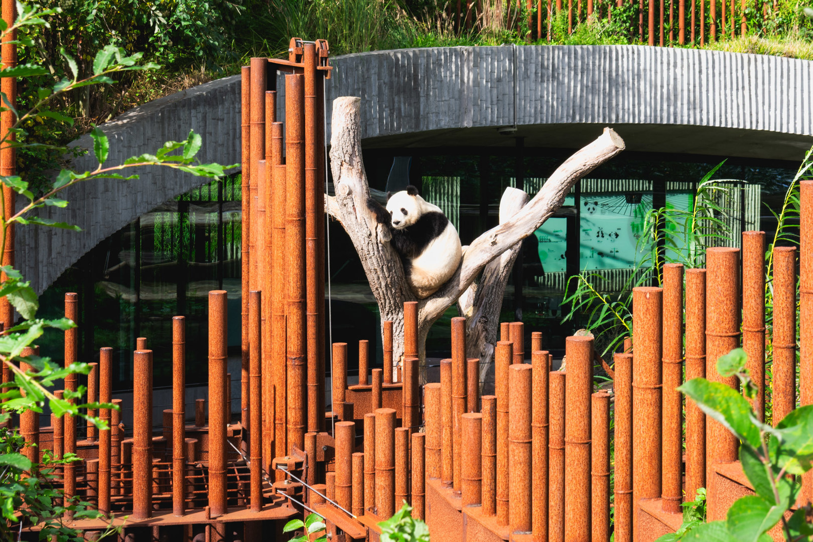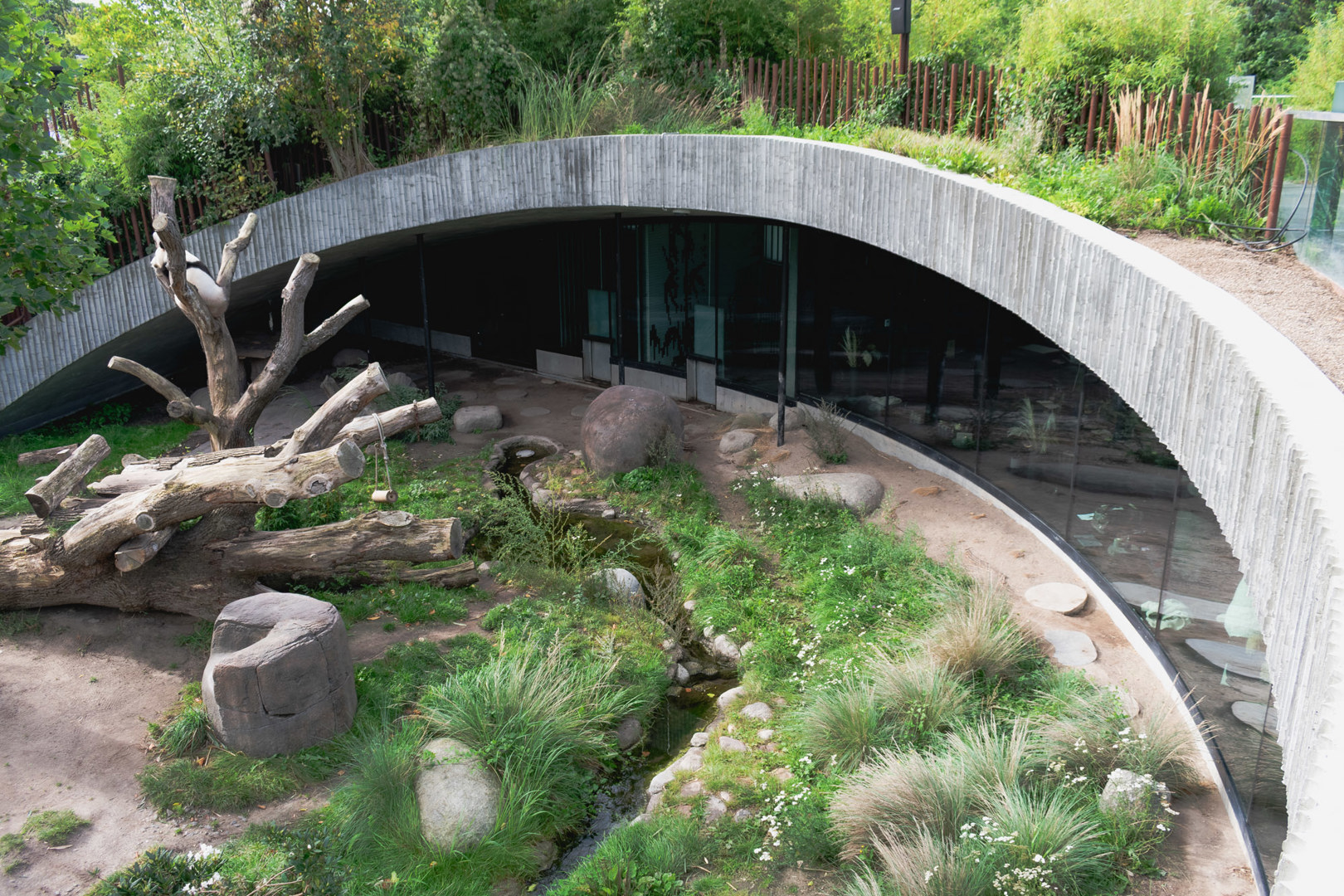 Wij lopen de omtrek van het verblijf. Met zijn weelderige vegetatie gaat het pandahuis op in de omliggende omgeving. Het ligt centraal tussen de verblijven voor de olifanten (Norman Foster) en de Tasmaanse kangoeroes (White Architekter).