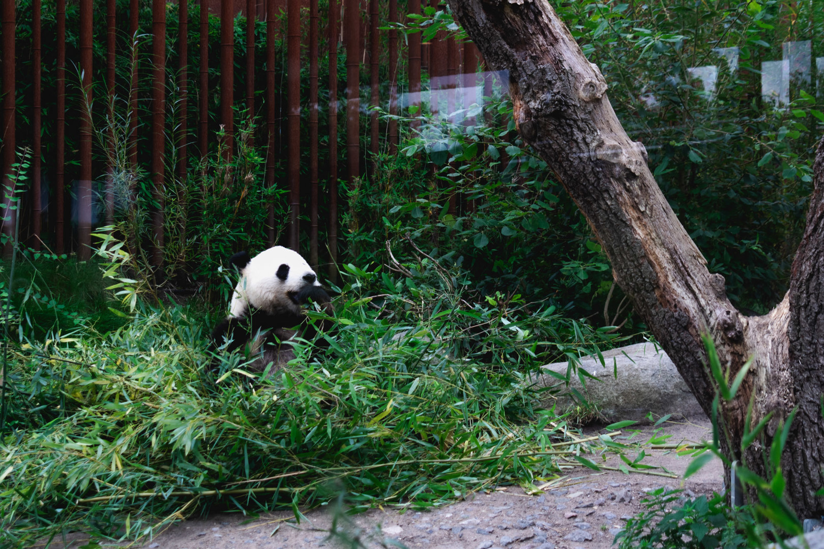Snel draaien we af naar de lagere paden. Door de tuin aan beide uiteinden op te tillen, ontstaat een golvend landschap dat direct zicht biedt op het leefgebied van de panda’s. De vegetatie en het landschap bootsen de natuurlijke habitat nauwkeurig na. Bamboestruiken, planten, rotsen, klimbomen en boomstammen bieden de panda's de mogelijkheid om zich terug te trekken, te rusten, te eten of schaduw te zoeken, terwijl ze toch zichtbaar blijven voor het publiek. Waterelementen, zoals bassins, beekjes en watervallen, zorgen voor verkoeling.