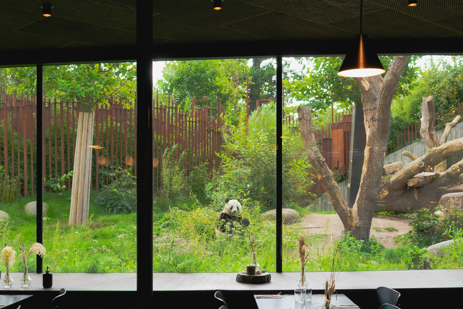 De scheiding tussen publiek en dieren is minimaal. Het uitzicht op ooghoogte versterkt de verbondenheid met de natuur en de panda’s. De panda’s zijn heel nabij. Ze trekken alle aandacht. Alle details ademen de panda. De architectuur vervaagt. We zijn helemaal in de ban van de panda’s en nemen meer foto’s van de dieren dan van de architectuur.