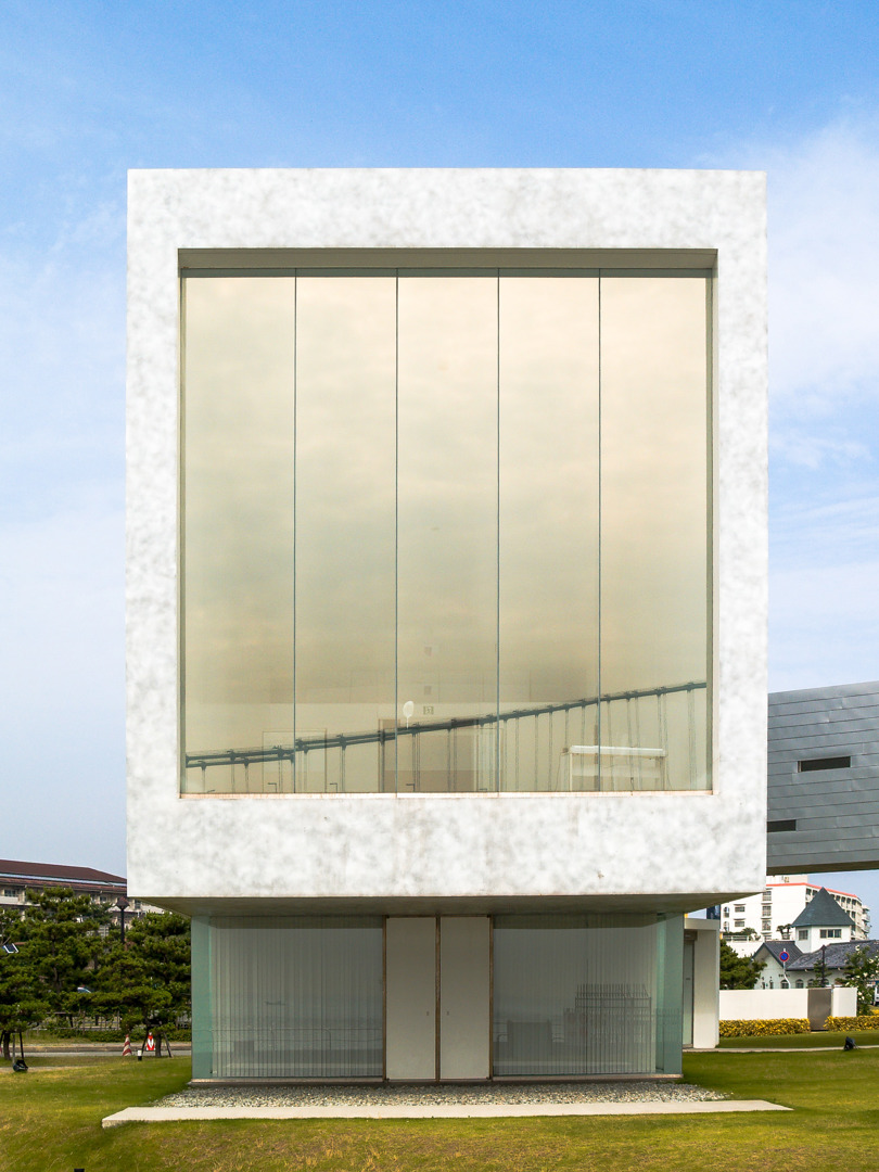 Vanuit de foyer van het hotel lopen we door een lange, witte, flauw oplopende gang, ruim verlicht met lange smalle ramen. De kapel is eerder klein. Het panoramisch raam, verdiepingshoog en -breed, kadert de indrukwekkende Akashi Bridge. De hangbrug dateert van 1998 en is met een lengte van bijna 4 km en een centrale overspanning van 1991 m. de op één na langste hangbrug ter wereld. (De Çanakkale-brug in Turkije is sinds 2022 de langste.) Onder de brug ligt de focus op Awajishima, dat landschap, zee en lucht verbindt.