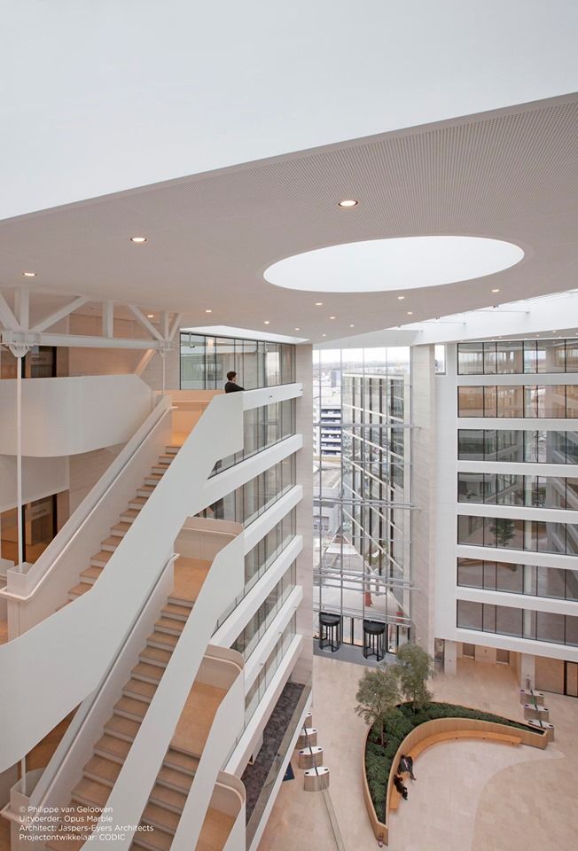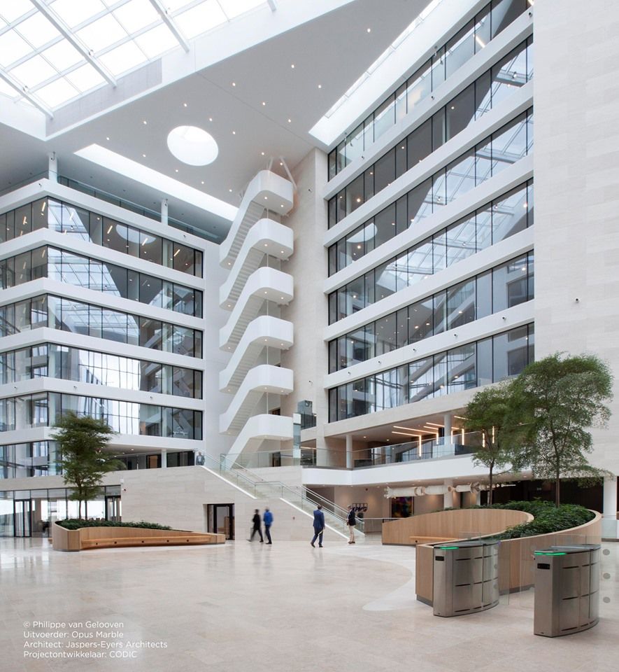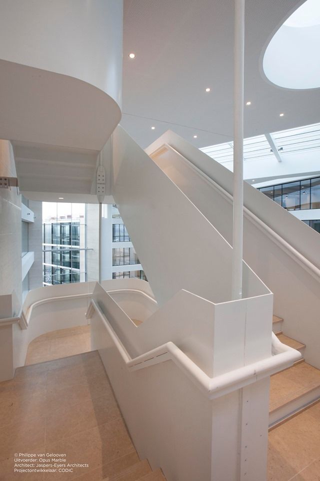 Op Brussels Airport is het complex ‘Passport’ verrezen: een state-of-the-art kantoorgebouw waar onder meer KPMG en Microsoft vestigingen in hebben ondergebracht. Jaspers-Eyers Architects zorgde voor het ontwerp. In het interieur springt de vloer-en trapbekleding meteen in het oog. Het gebruik van de Egyptische kalksteen Sinai Pearl in de verzoete en sabbiatino-afwerking van Beltrami Natural Stone heeft daarin een belangrijke rol gespeeld.