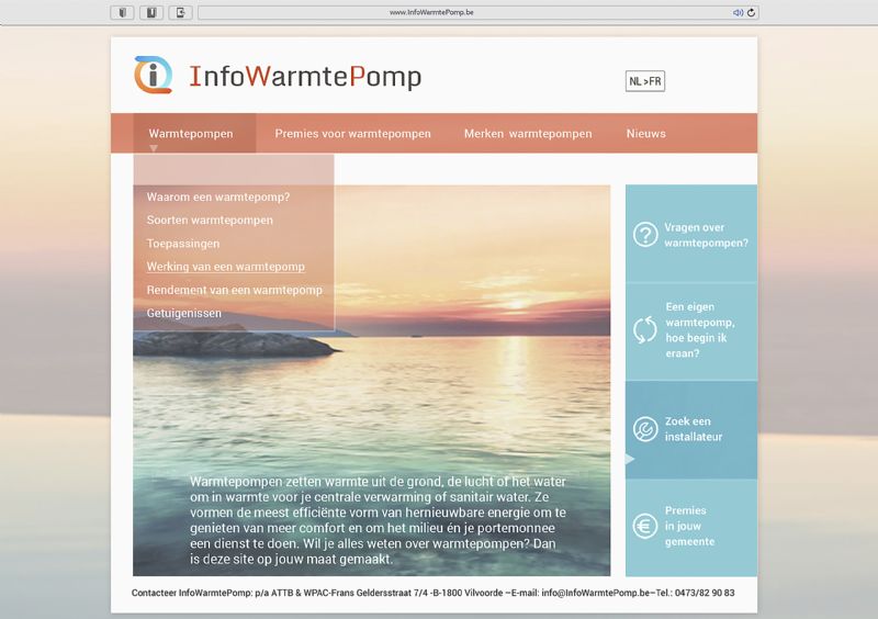 Maar hoe werkt een warmtepomp precies? Waarom zou ik een warmtepomp installeren? Welke soorten warmtepompen bestaan er? Op welke premies kan ik aanspraak maken? Hoe begin ik eraan? Voor een niet-merkgebonden antwoord op deze en tal van andere vragen over warmtepompen kan je sinds februari 2016 terecht op www.infowarmtepomp.be (voor Franstaligen: www.infopompeachaleur.be), een gezamenlijk initiatief van ATTB sectie 4 (warmtepompen en alternatieve systemen) en WPAC.