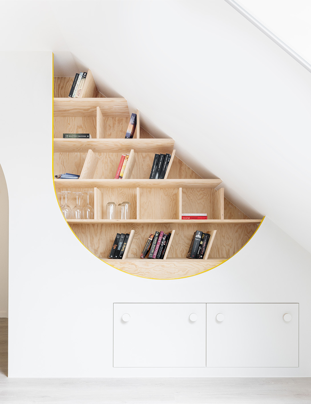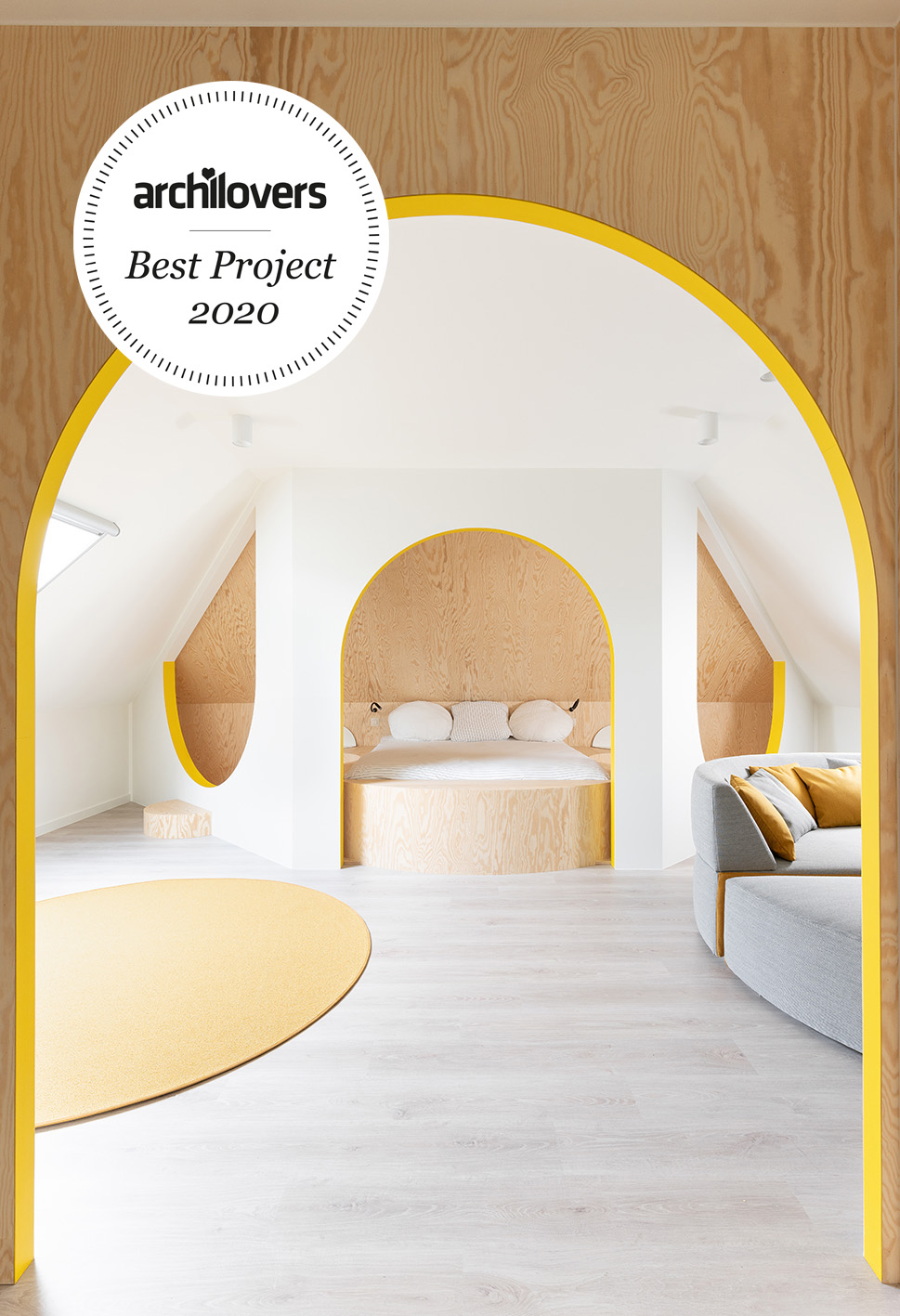 De gebogen lijnen geven de zolder een ontspannend gevoel. De algemene esthetiek van ontspannen geometrie levert een aangename vloeiende structuur op die gecompenseerd wordt door gele accenten die optimisme en energie uitstralen.