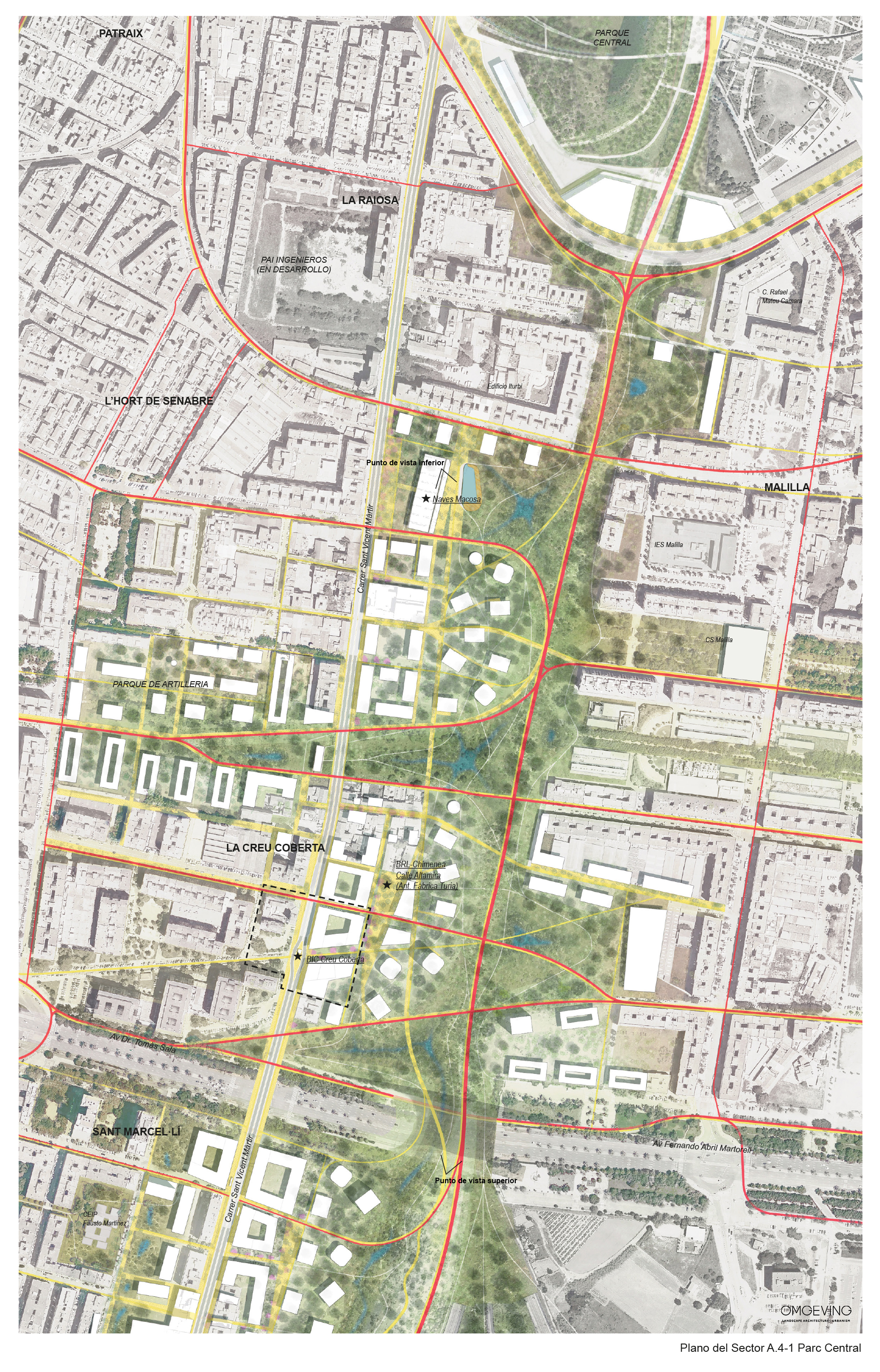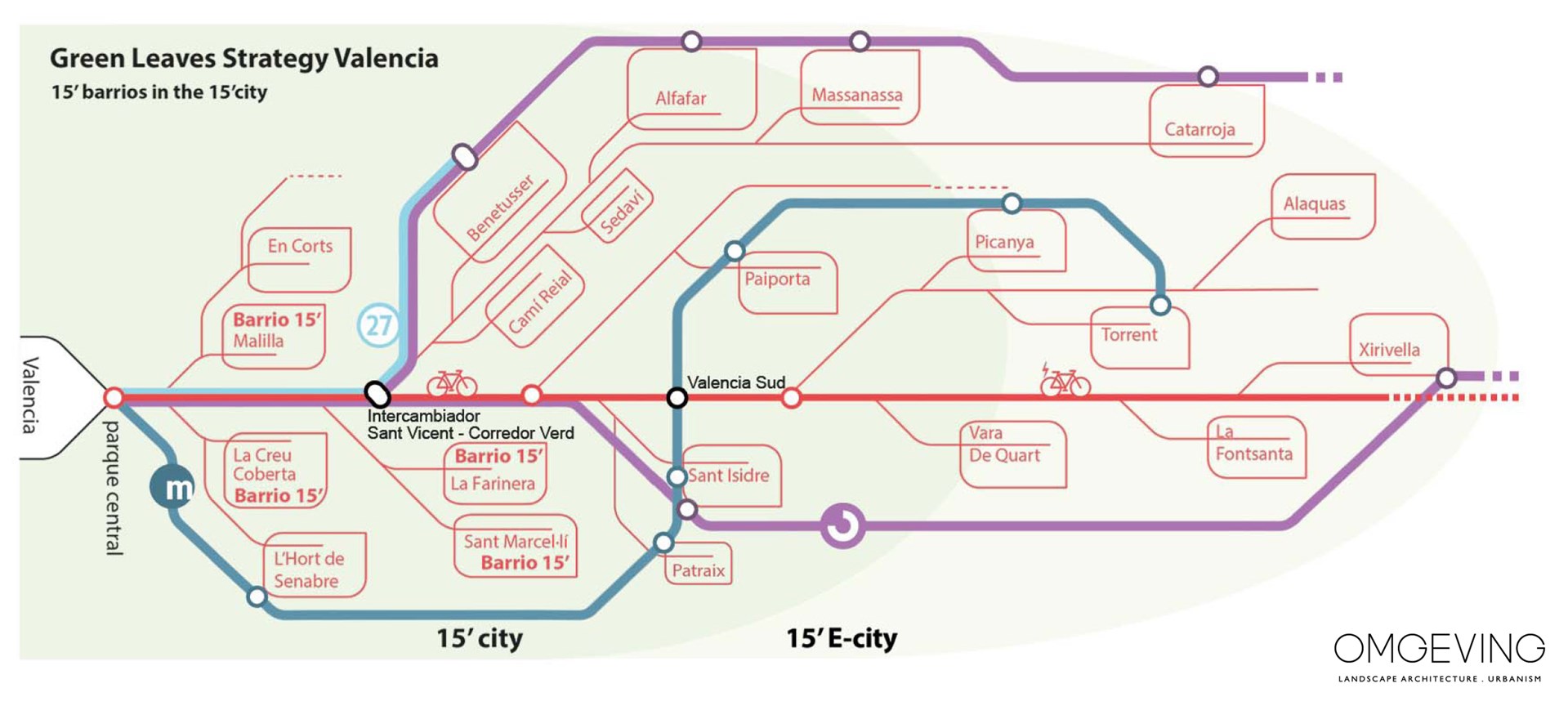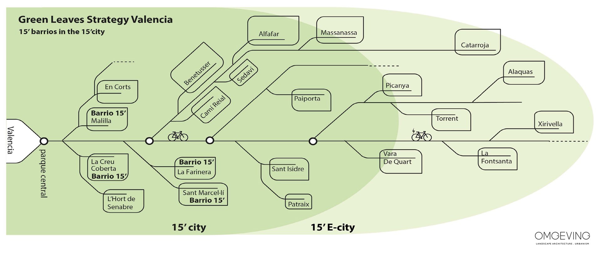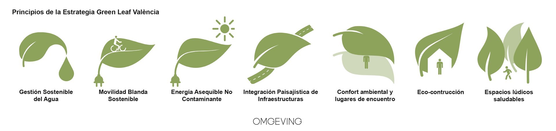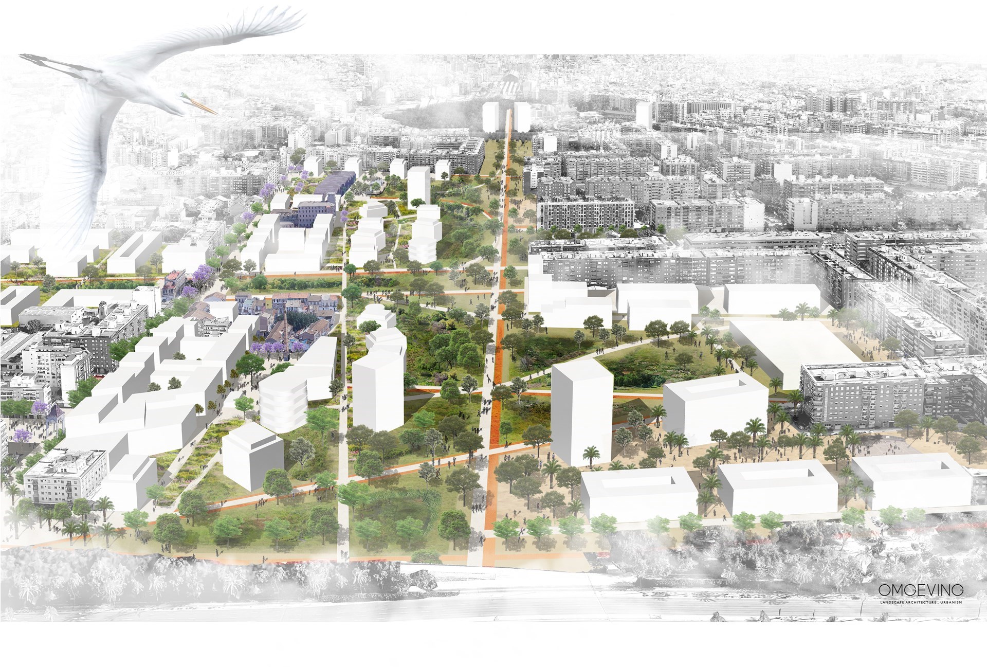 Het ambitieuze landschapsproject past binnen de visie om van Valencia een klimaatrobuuste “15 minuten stad” te maken. OMGEVING kon de jury overtuigen met hun ‘Green Leaves Strategy’. Het langgerekt landschapspark vormt de ‘hoofdnerf’ van waaruit de omliggende wijken stelselmatig vergroenen. De inwoners van Valencia krijgen hierdoor meer verkoeling in de straten tijdens hittegolven en droogte.