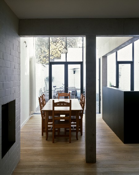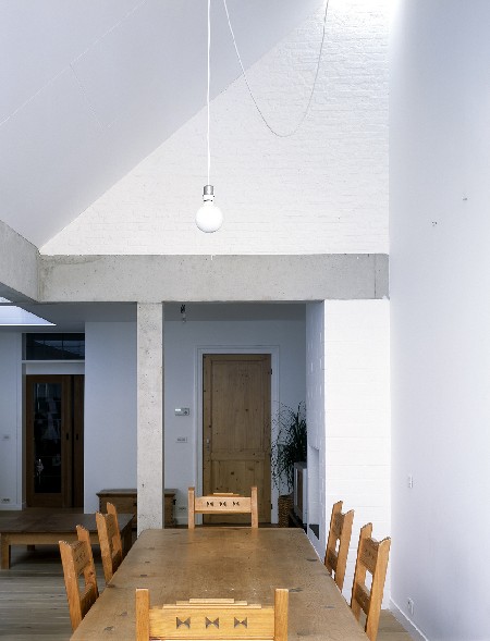 In tegenstelling tot de origineel massieve metselwerk volumes wordt hier met een heel open structuur gewerkt. De betonnen constructie schakelt drie gekoppelde ruimtes in de gewenste positie en verhouding. Leefruimte, keuken en eetplaats worden gegroepeerd en staan nu in direct contact met de tuin. Deze werkt nu als een ‘buitenkamer’ in directe relatie met het interieur.