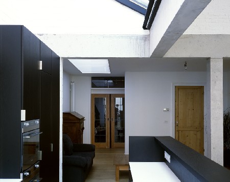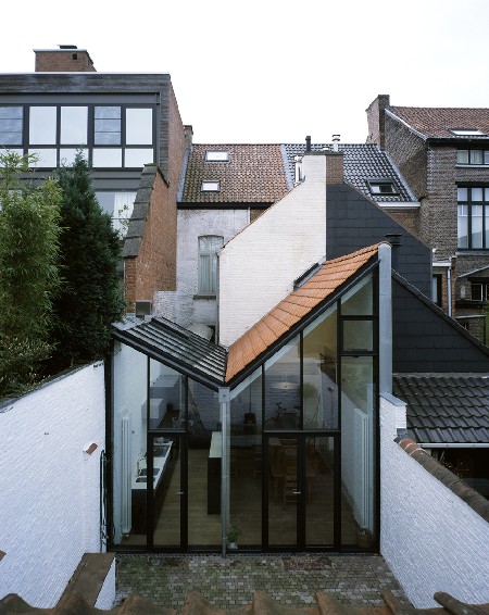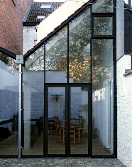 Doordat de oorspronkelijke achterbouw van de woning bestond uit een opeenvolging van drie volumes was er een enge en lange doorgang naar de nauwelijks zichtbare achterliggende tuin. Die beperkte relatie met de buitenruimte en het gebrek aan licht voldeed niet aan de wensen van de bewoners. Vandaar dat men de doorgang naar de tuin met glas overdekt heeft. Dit resulteert in een vlinderdak, één zijde open beglaasd, de andere gesloten met dakpannen. In tegenstelling tot de voormalige achterbouwen met keuken en berging, waarvan de daken enkel onbruikbare zolders waren, worden de nieuwe hellende daken nu ook binnenin voelbaar gemaakt. In de met glas overdekte voormalige nauwe doorgang zit de nieuwe keuken. Deze ruimte roept een buitensfeer op, vergelijkbaar met die in een orangerie. Naast het staalschrijnwerk, werkt ook het zichtmetselwerk mee in het versterken van die ervaring.