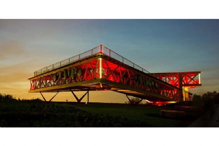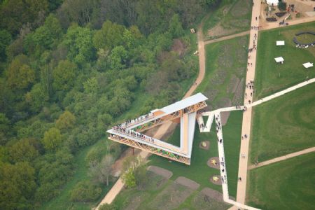 De bezoeker begint zijn tocht binnenin de constructie en komt uit op het dak van het paviljoen. Lopend van hoek naar hoek, heeft hij uitzicht over de natuur, de stad en over de belvédère zelf.