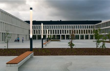 Om het vredige karakter van de campus te onderstrepen kozen de architecten voor identieke gevelelementen van beton. De opvallende elementen zijn schuin geplaatst en zorgen voor een aangename lichtinval in de kamers. Ze beletten dat rechtstreeks zonlicht de kamers te snel opwarmt. De vloer van de gemeenschappelijke ruimtes is van blauwe steen. Dit harmonieert met de lichte kleur van de betonnen muren. Sommige muren werden bekleed met gezaagde blauwe steen, dat levert een krachtig beeld op en heeft een signaalfunctie voor de bezoekers.