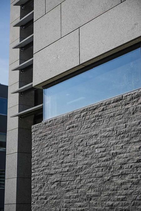 De panelen voor de zonnewering zijn geslepen. Het oppervlak is gladgeslepen en met zeer fijne cirkelvormige streepjes bedekt met als resultaat een blauwgrijze tint. De lange smalle muur werd uitgevoerd in Brickeno. Dit is blauwe hardsteen op het formaat van een baksteen, 5-zijdig verzaagd en aan de zichtbare zijde gebroken.