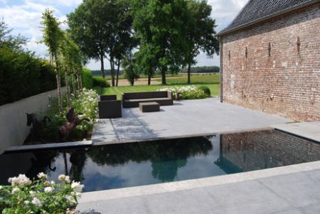 Het terras bestaat uit tegels van ruw gezaagde blauwe steen. Deze afwerking maakt de tegels glad en lichtgrijs van kleur. De boordstenen, de overloop en de rest van het zwembad zijn uitgevoerd in gevlamde blauwe steen. De steen wordt bewerkt met een brander. Door de thermische schok barsten de oppervlaktekorrels open en ontstaat een specifieke textuur. Door deze antislipafwerking is de steen ideaal voor buitengebruik.