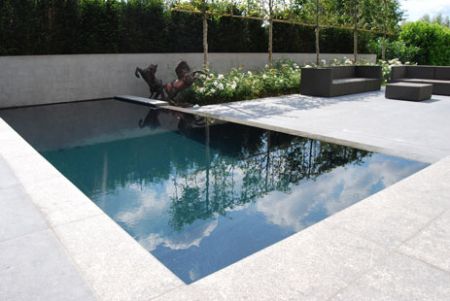 De donkerblauwe weerspiegeling van het zwembadwater zorgt voor contrast met de lichtere stenen.