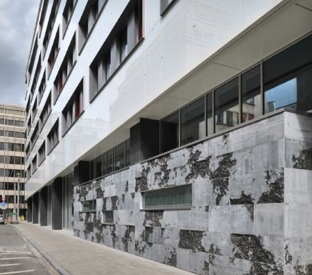 Een ander mooi voorbeeld van creatief omgaan met blauwe steen is het Thon Hotel in Brussel. Altiplan Architects, met vestigingen in Luik en Brussel, tekende dit project en won hiermee in de categorie Composities. De gevel bestaat uit wit gelakt glas met een sokkel van steen. Het strakke uiterlijk van de glazen gevel contrasteert met het willekeurige motief van het stenen gedeelte. Voor deze stenen muur gebruikten de architecten de eerste stukken van de blokken blauwe steen. Dit materiaal wordt over het algemeen niet gebruikt.